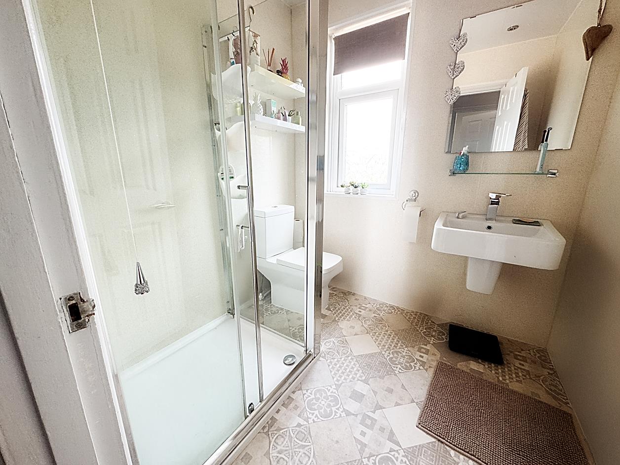 Shower Room - Comprising: shower cubicle, WC, hand wash basin, radiator, double glazed window and spot lights.
