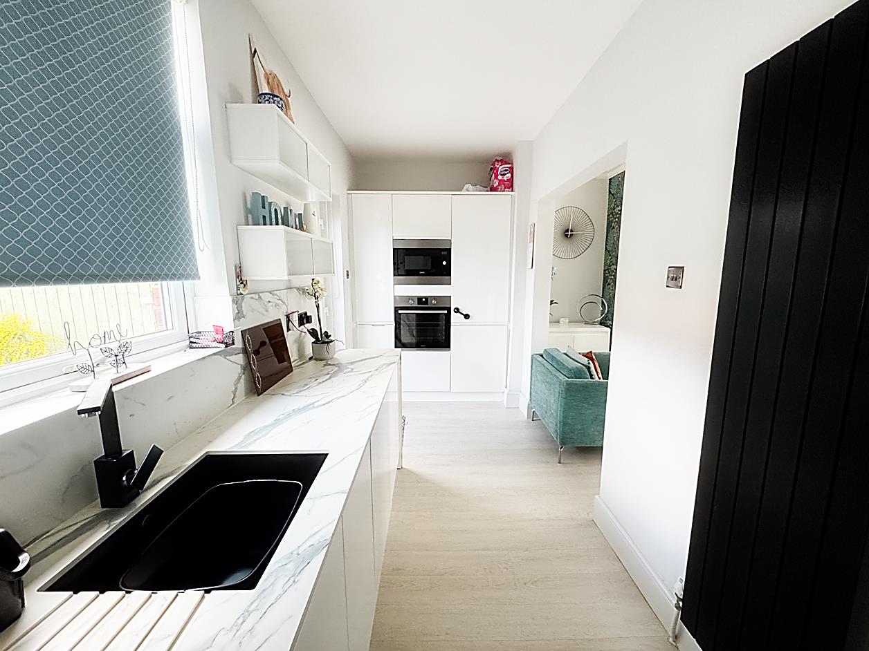Kitchen - 5.00 x 1.78 (16'4" x 5'10") - Fitted with range of modern wall and base units with complimentary work surfaces, sink unit, integrated washing machine, integrated fridge freezer, built in microwave, induction hob and built in electric oven, laminate flooring, vertical radiator, double glazed window and door to rear garden.