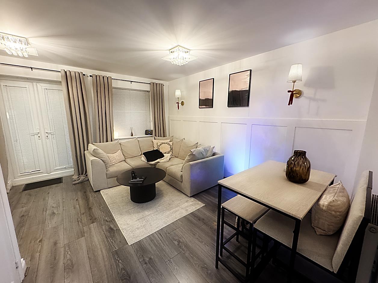 Lounge - 4.34 x 4.04 max - Double glazed French doors to the rear garden, double glazed window, radiator, and an under stairs storage cupboard, laminate flooring.