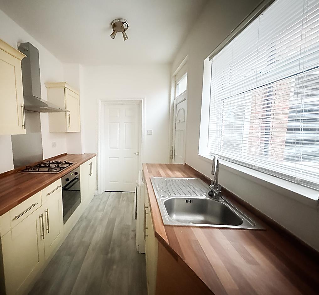 Kitchen - 3.14 x 2.15 (10'3" x 7'0") - Fitted with a range of wall and base units with work surfaces, sink unit with tap and drainer, double glazed window to the side elevation, double glazed door leading into the rear yard, built in gas hob, oven and extractor hood, access into the lobby and the bathroom.