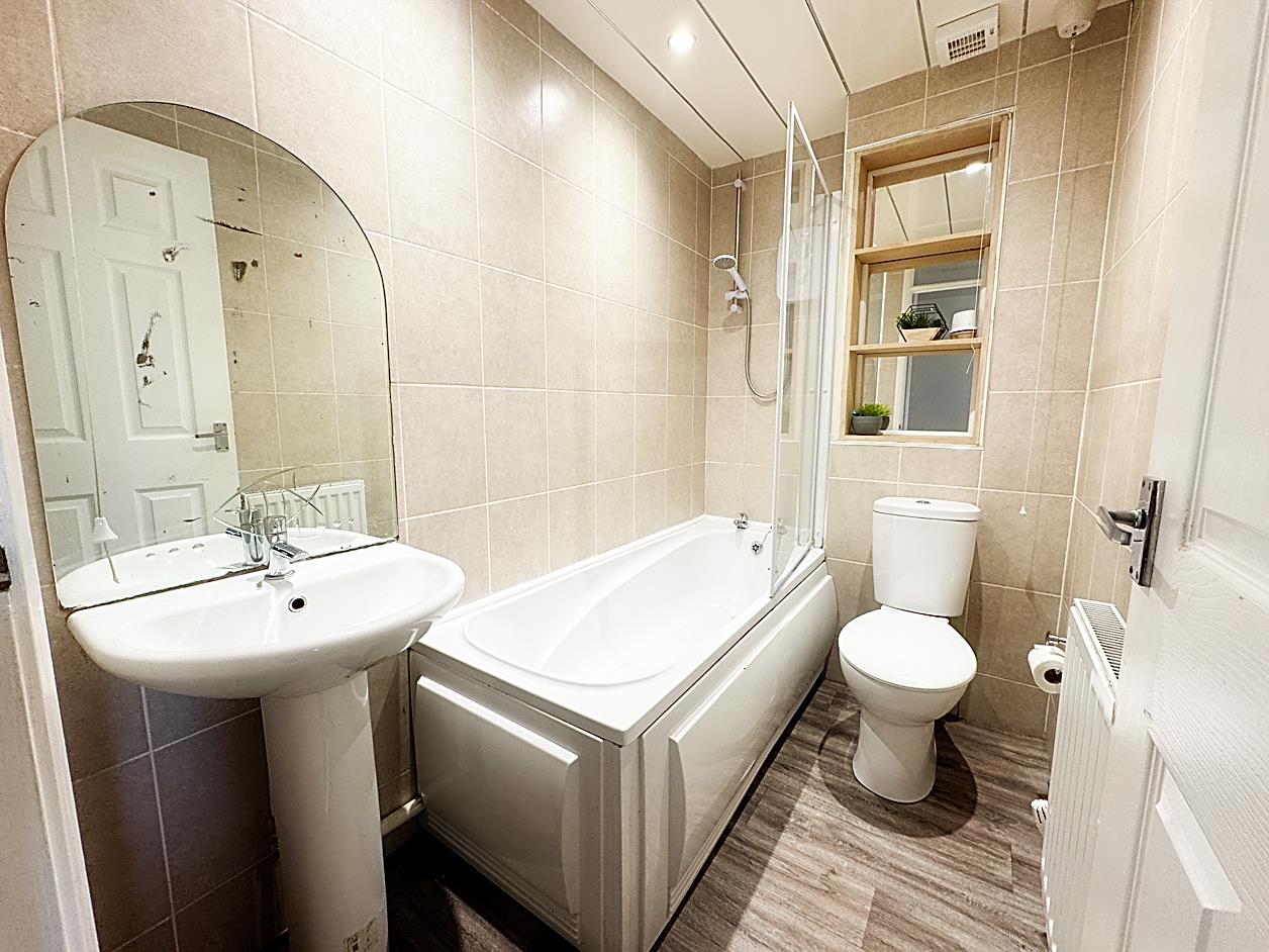Bathroom - Fitted with bath with overhead shower, WC, wash hand basin, tiling to the walls.