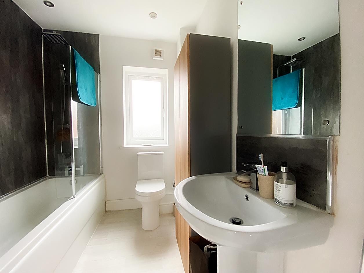 Bathroom - 2.72 x 1.94 (8'11" x 6'4") - Comprising; bath with shower over, WC and wash hand basin. Double glazed window, cupboard, part panelled walls, electric ladder style radiator.