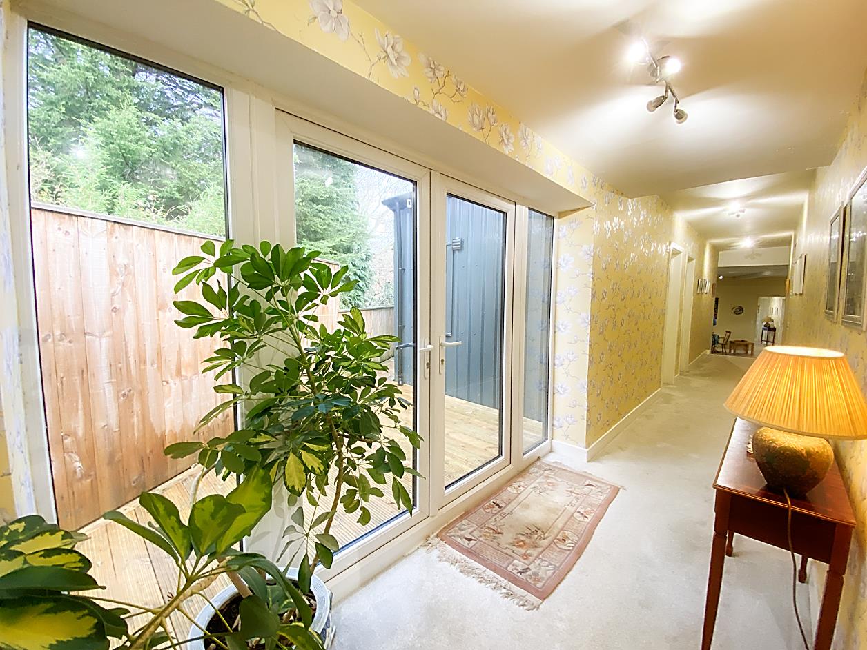 Hallway - An impressive hallway that has a double glazed composite entrance door with window to the side, radiator and stairs to the first floor where the master bedroom is situated., further along the hallway there are French doors that lead out to a decked patio area.