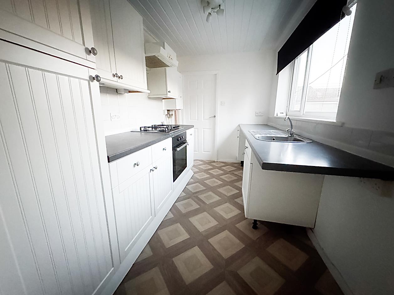 Kitchen - 3.43m x 2.24m - UPVc double glazed window, part tiled walls, fitted with floor and wall units, work surfaces, sink unit, gas hob with an electric oven, extractor hood, plumbed for washing machine.