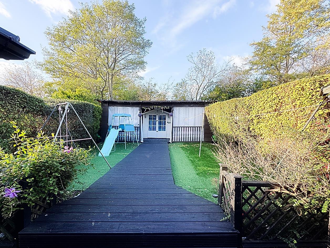 External - To the front there is a driveway with ample parking for multiple cars. To the rear there artificial turf and decked walkway to summerhouse.