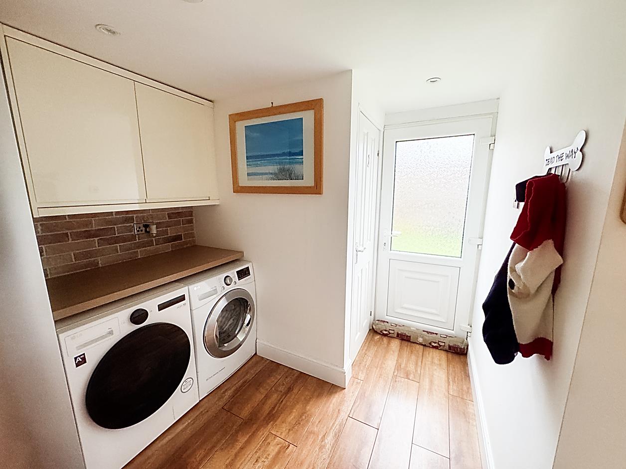 Utility Room - 2.35 x 1.81 (7'8" x 5'11") - Plumbed for washing machine and space for dryer with work surface over and wall cupboards, part tiled walls, double glazed external door.