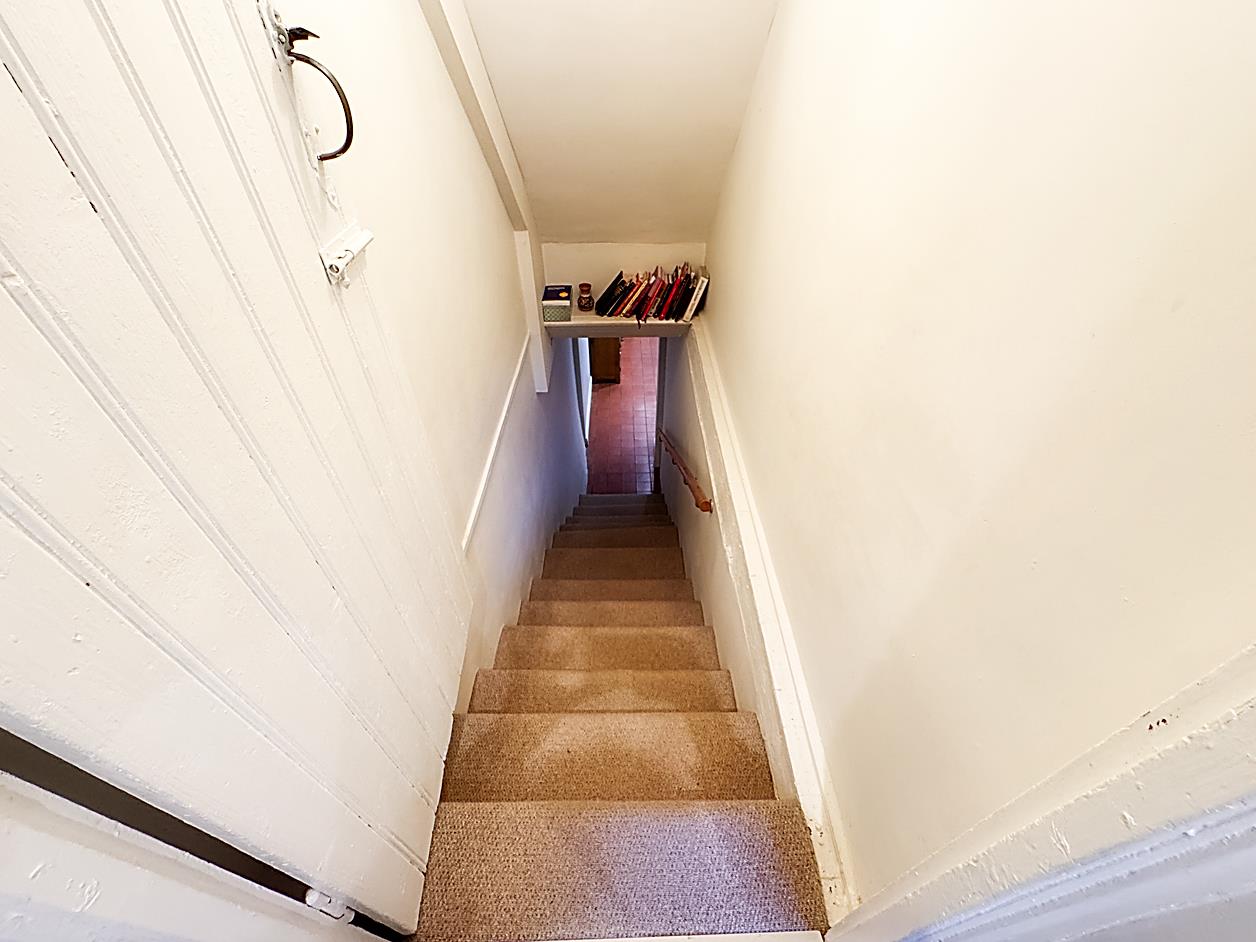 Hallway - Stripped wood flooring, radiator, cornice and stairs to first floor