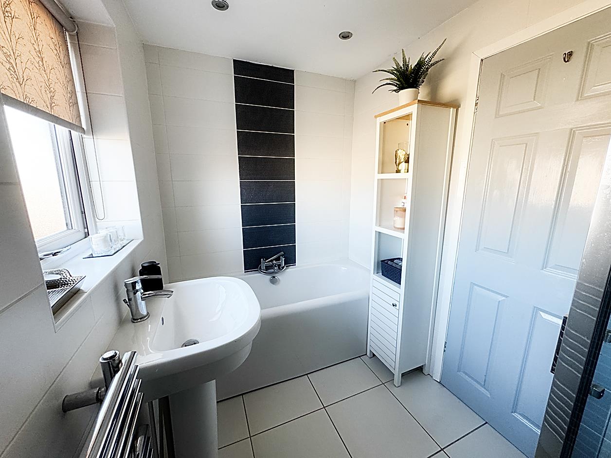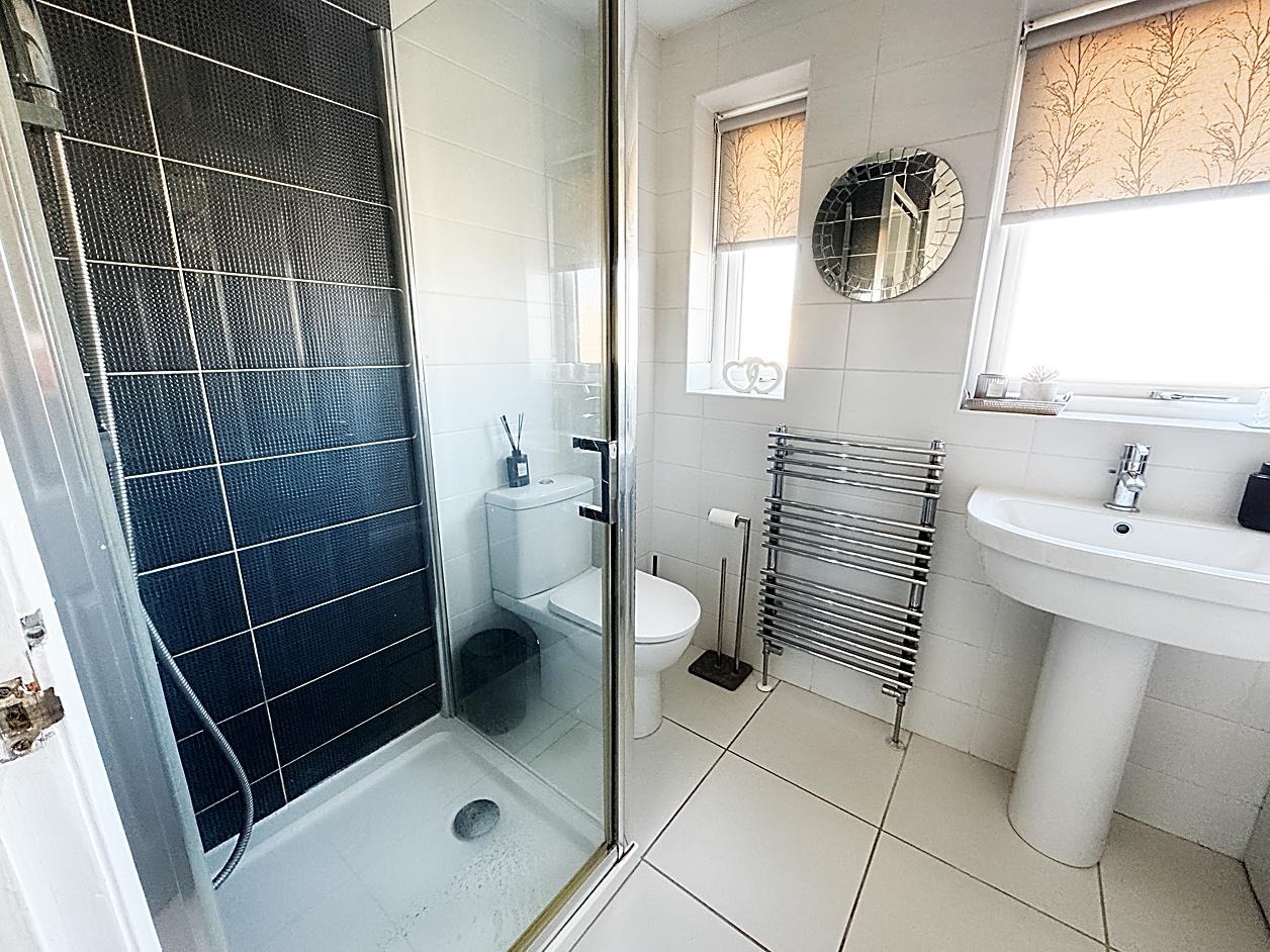 Bathroom - 2.72 x 1.70 (8'11" x 5'6" ) - Two double glazed windows, ladder style radiator, WC, wash hand basin, bath with shower attachment and separate shower cubicle.