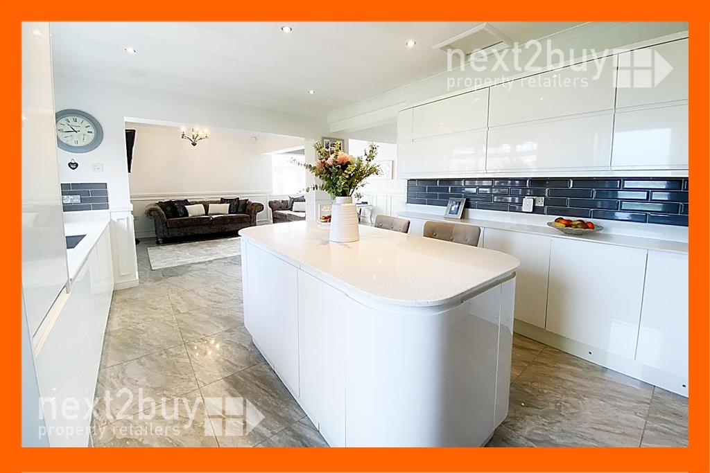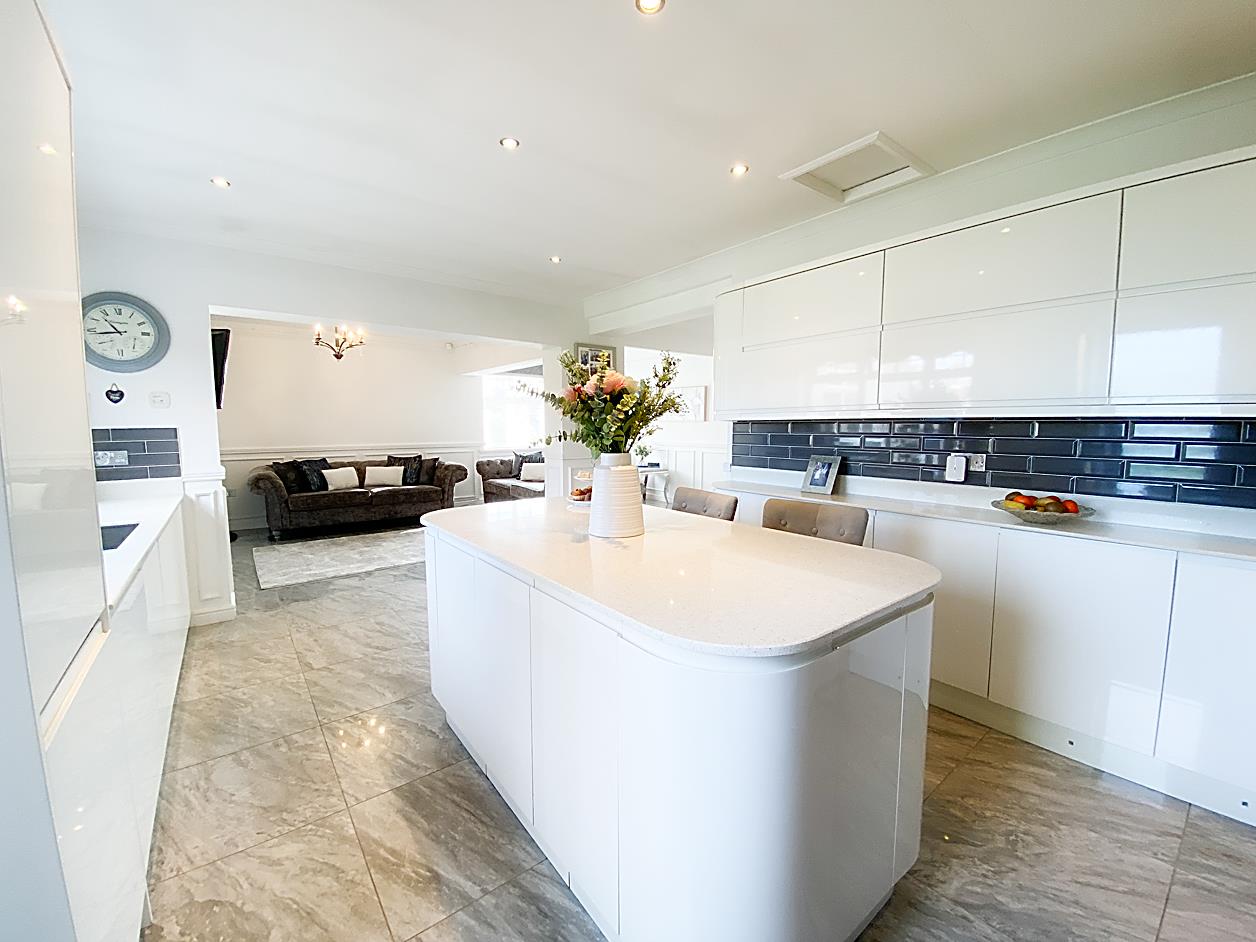 Kitchen Area - 5.09 x 3.57 (16'8" x 11'8") - Fitted with a range of wall and base units with work surfaces over and central island, range style cooker, integrated fridge and freezer, sink unit. Double glazed window, spotlights to ceiling, external door to the rear garden.