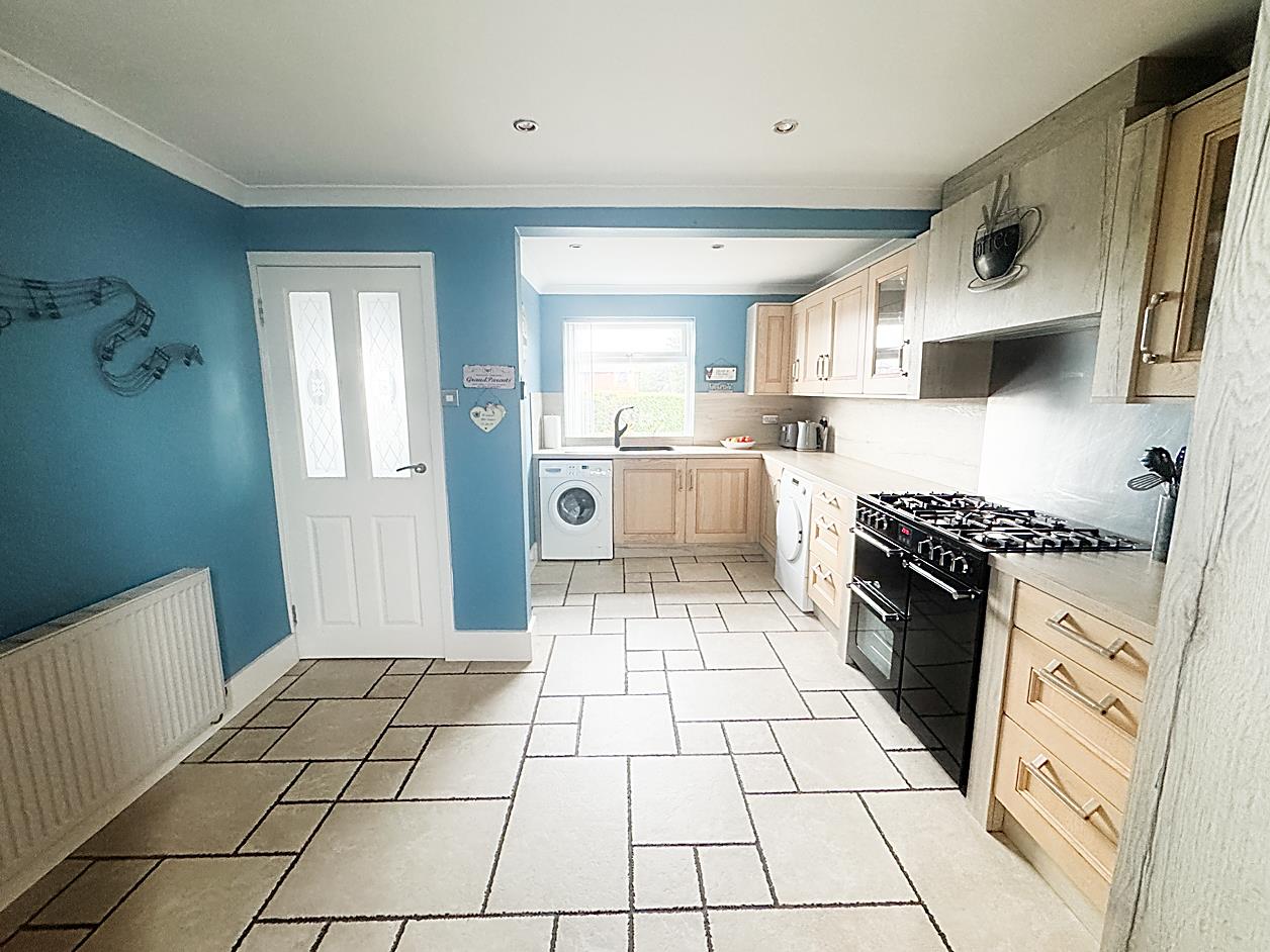 Kitchen - 4.92 max 3.46 max (16'1" max 11'4" max ) - Double glazed window to front elevation, UPVC door to rear, radiator, fitted with range of wall and base units with countertops, sink, range style cooker, integrated fridge freezer, plumbed for washing machine and dishwasher, tile floor.