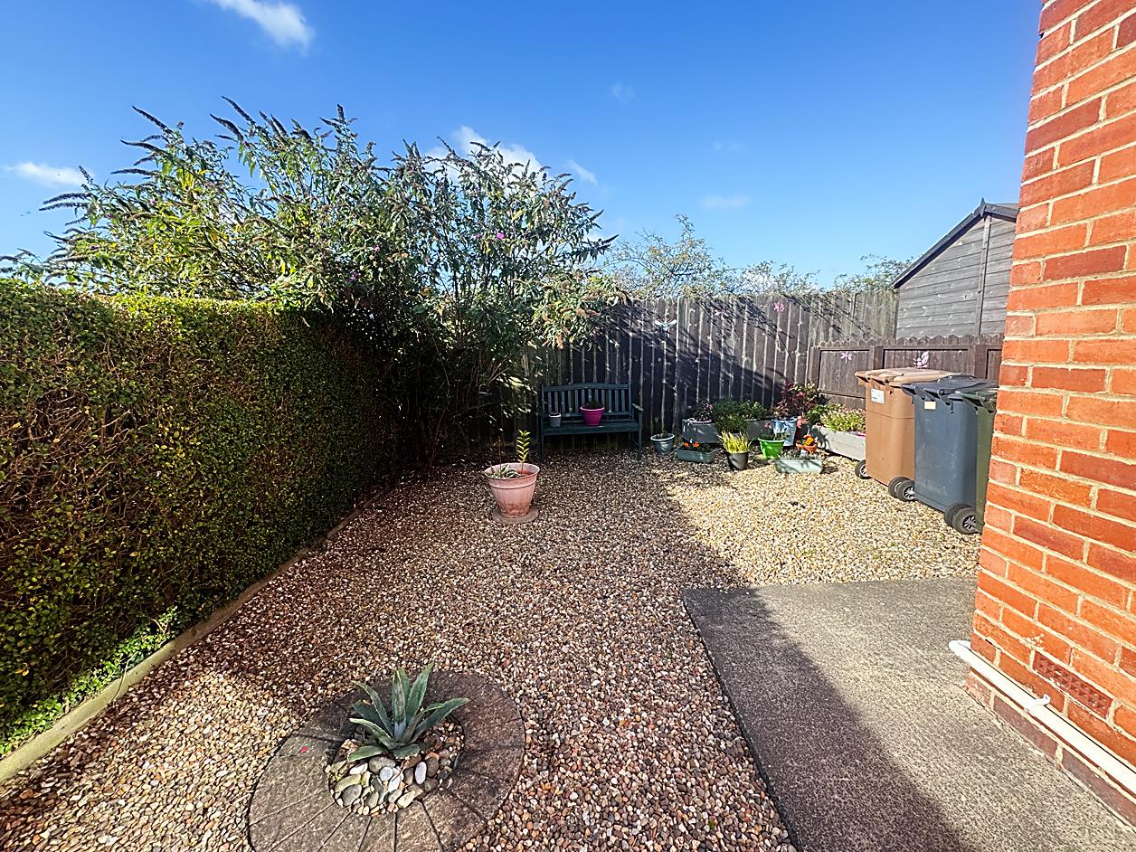 External - To the front there is a walled garden with hedgerow and to the rear there is a low maintenance garden with large storage shed.