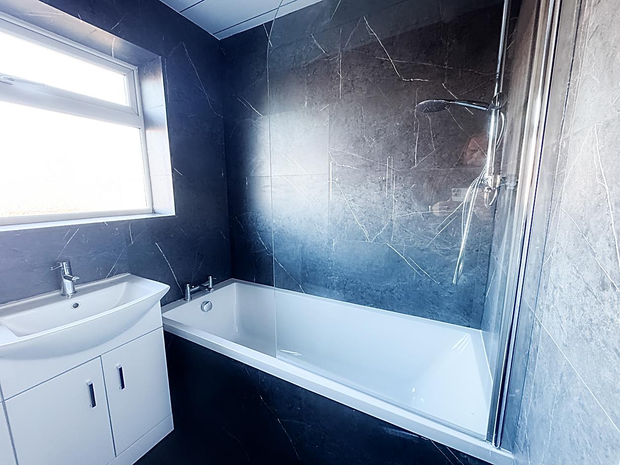 Bathroom - 1.84 x 1.71 (6'0" x 5'7") - Bath with overhead shower, WC and sink set in vanity unit, double glazed window, ladder style radiator.