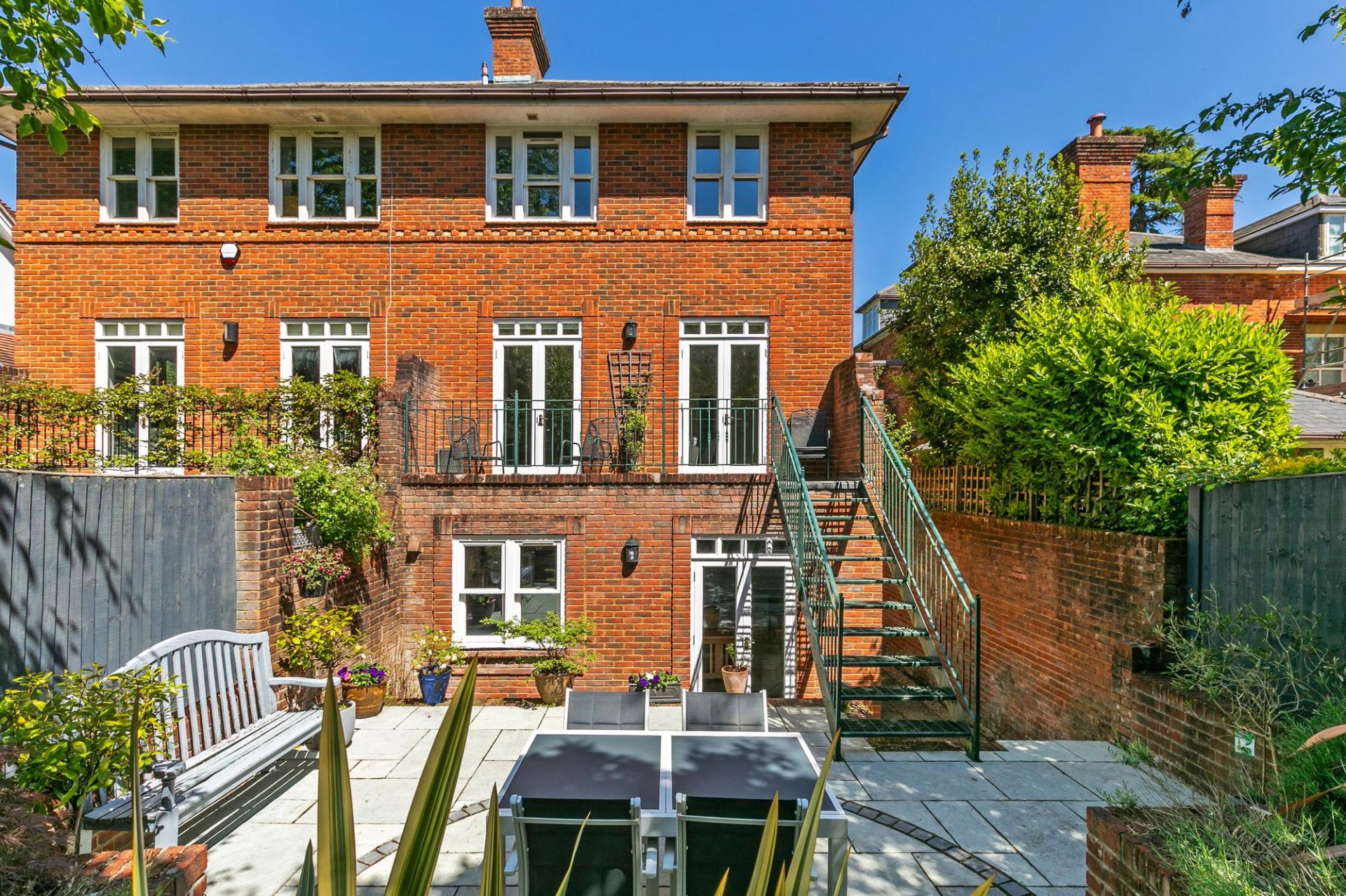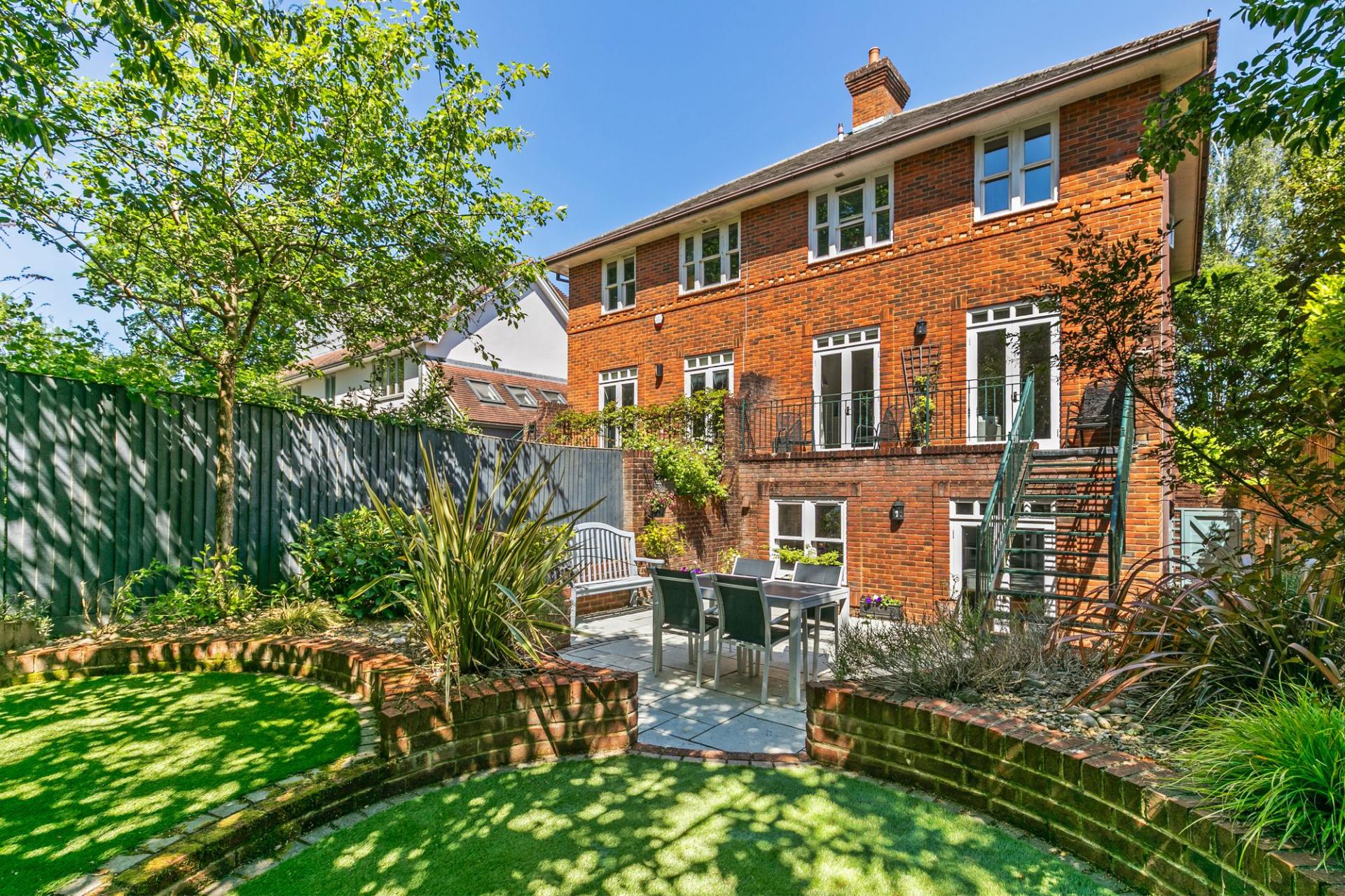 The second floor has a guest bedroom ensuite, and the two further bedrooms are served by a bathroom. Additionally, there is a boarded loft with Velux window. The rear garden has been professionally designed and faces due south, providing a low maintenance outside space with attractive shaped terraces with raised brick planters, graduating to an area of artificial grass with several small trees and further shrubs. The house is set back from the road behind a brick wall with attractive laurel hedging, a pair of gate piers open onto a block paved driveway with parking for two cars, a car charging point and garage.