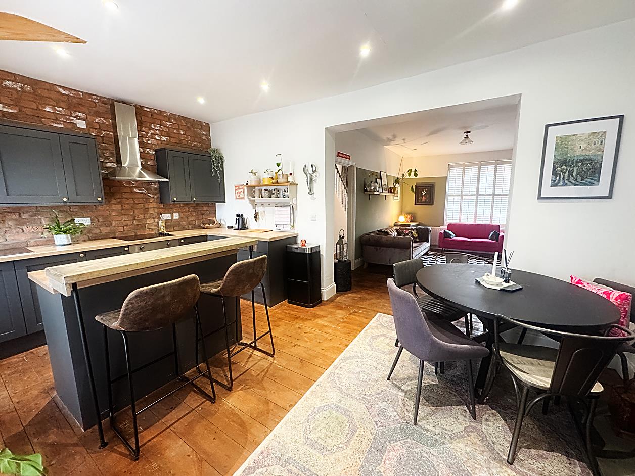 Kitchen - 5.15 x 3.44 max (16'10" x 11'3" max) - Stripped wood flooring, range of base and wall units with countertops, stainless steel sink with drainer, built in electric oven and hob with extractor hood, integrated undercounter fridge and freezer, double glazed window, breakfast bar, exposed ceiling beams and brickwork.