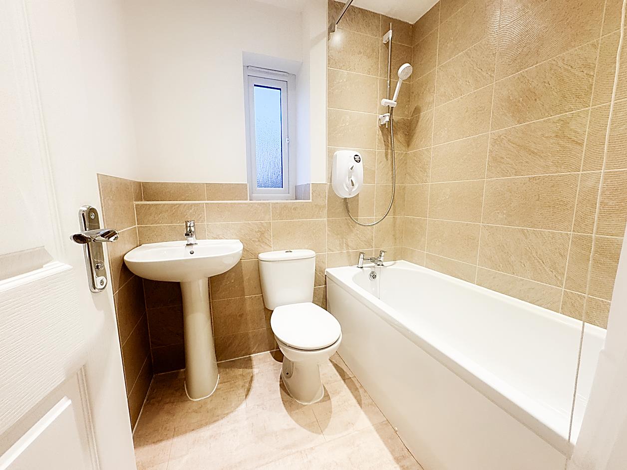 Bathroom - 1.88 x 1.85 (6'2" x 6'0") - Bath with shower over, WC and wash hand basin. Double glazed window, part tiled walls, ladder style radiator.