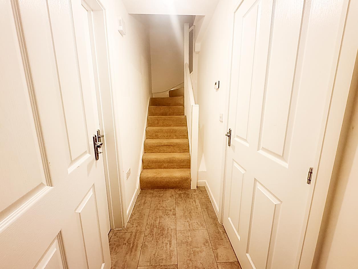 Rear Hallway - Stairs to the first floor landing, tile effect flooring.