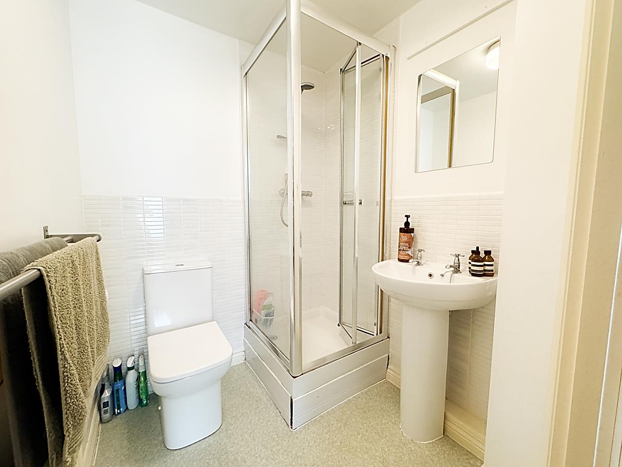 En-Suite - 1.67m x 1.46m - Radiator, air vent, WC, pedestal hand wash basin and shower cubicle. Part tiled walls.