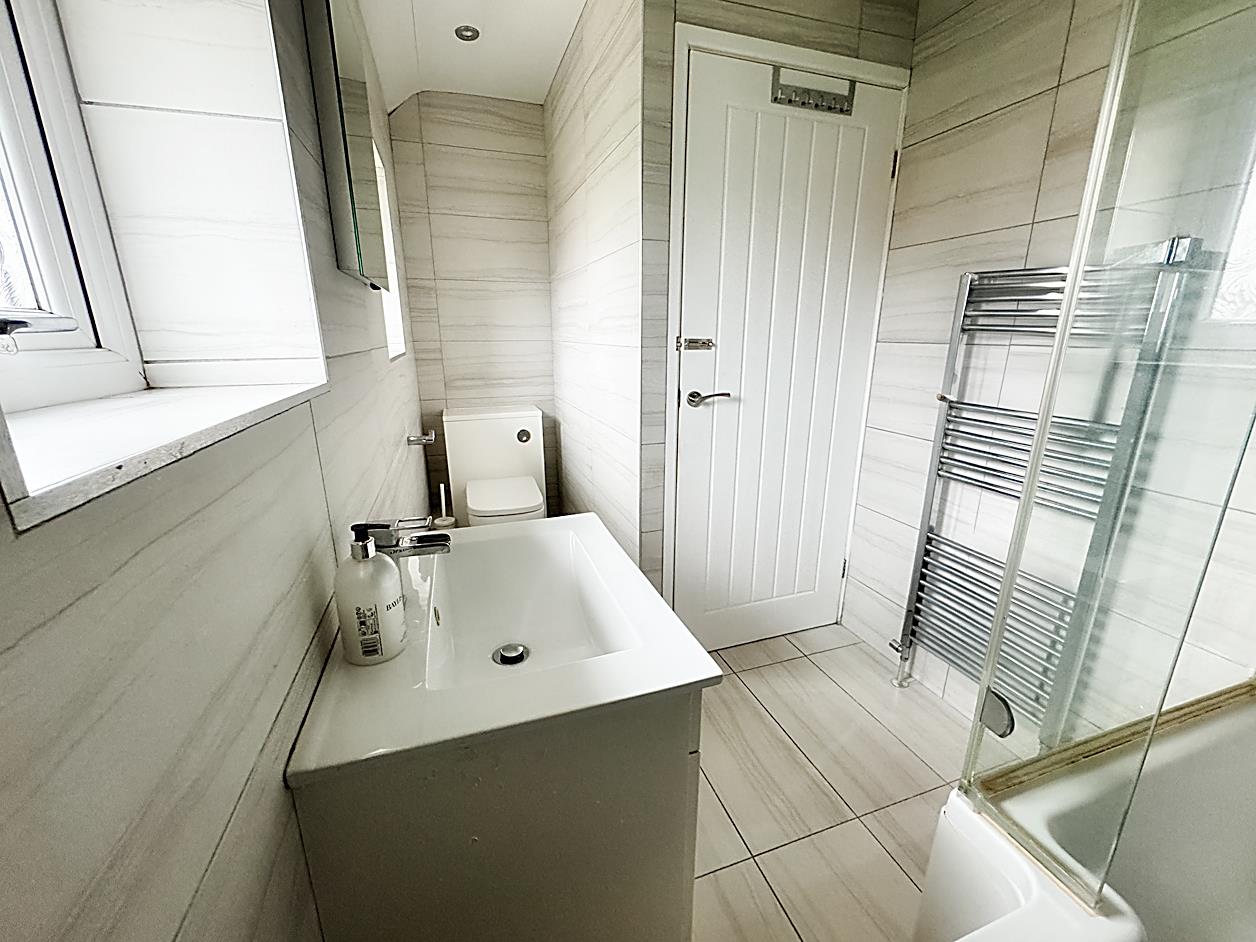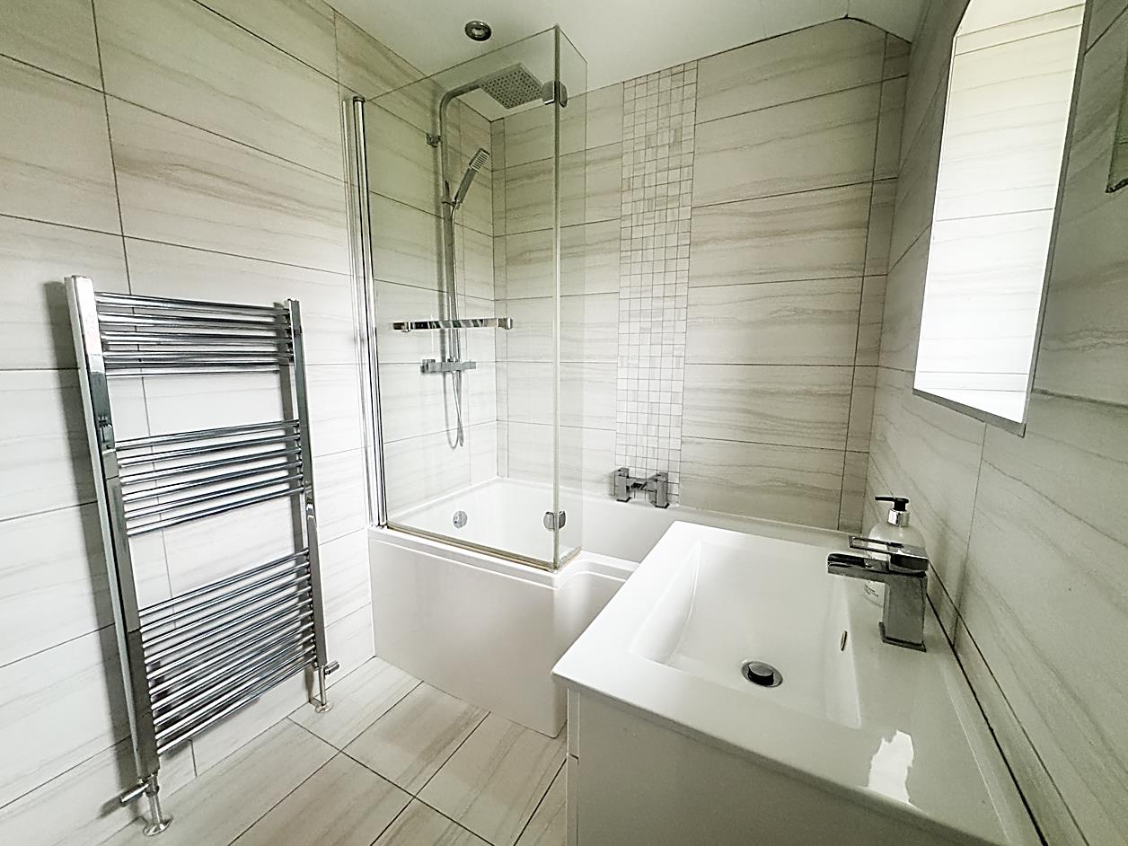 Bathroom - 3.37 max x 1.65 (11'0" max x 5'4" ) - Comprising bath with overhead shower , WC, wash hand basin set in vanity unit, fully tiled walls, ladder style radiator, two double glazed windows.