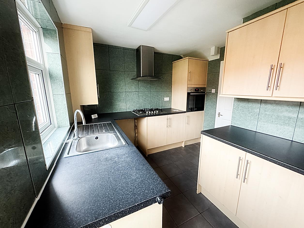 Kitchen - 6.04 x 2.90 max (19'9" x 9'6" max ) - UPVC door to rear garden, double glazed windows, radiator. Range of wall and floor units with countertops, five ring gas hob with extractor hood, built in oven, plumbed for washing machine, tiled walls and floor.