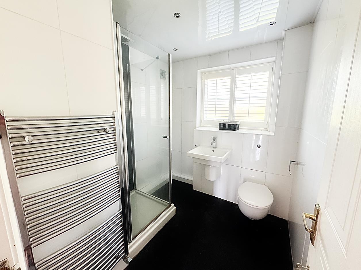 Shower Room - 7'9 x 4'8 - Double glazed window to the rear elevation with plantation style shutters, ladder style radiator, WC, hand wash basin, shower cubicle.