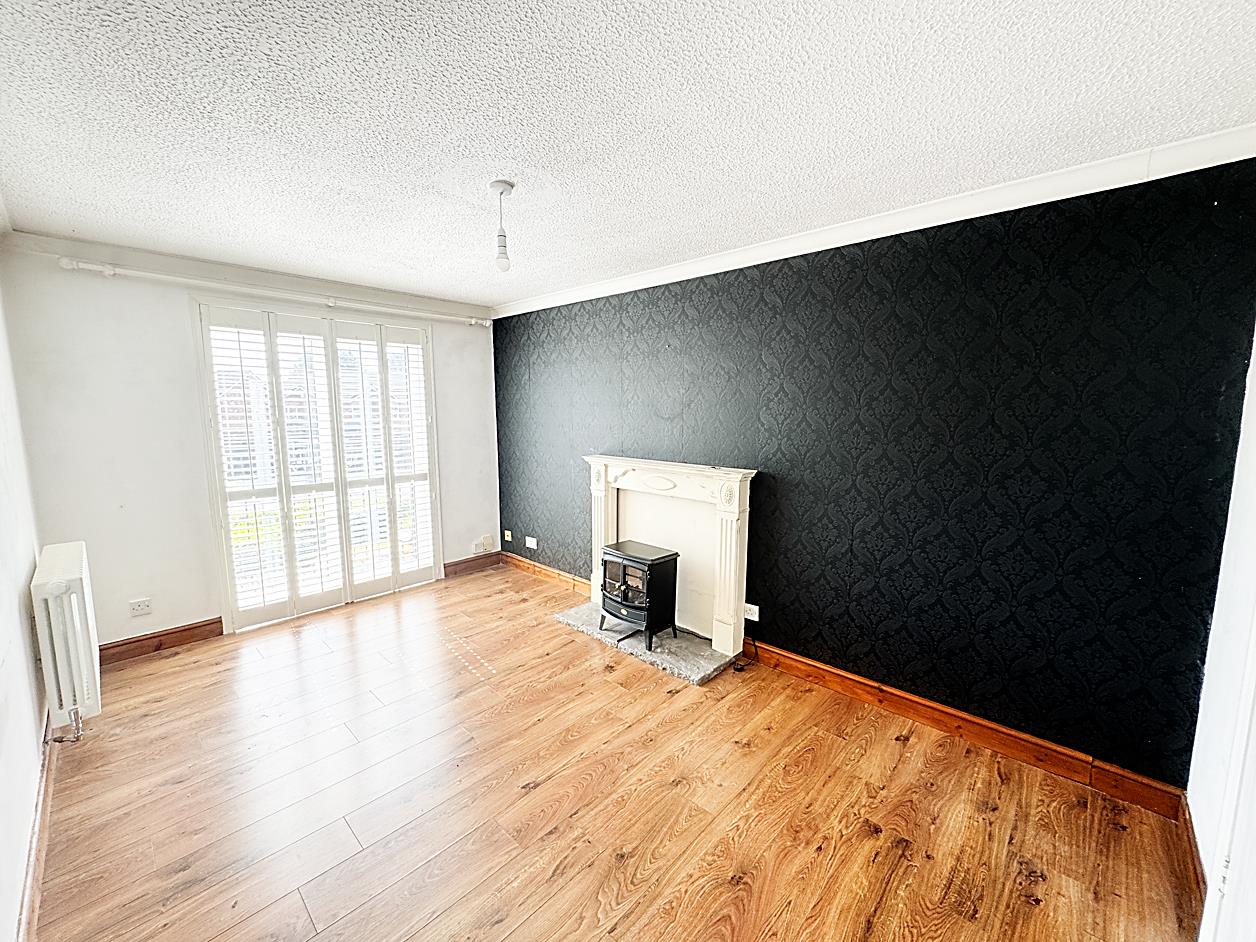 Living Room - 14'2 x 9'0 - Double glazed patio doors with a Juliet balcony, and plantation style shutters, radiator, decorative coving, laminate flooring, and a feature fire place.