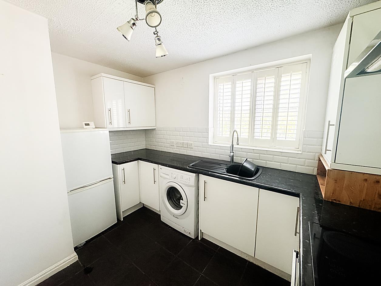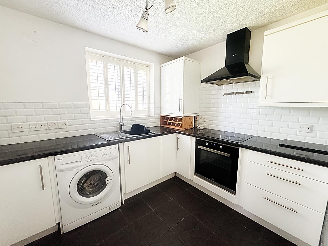 Kitchen - 2.46 x 3.25 - Double glazed window to the rear elevation with plantation style shutters, ladder style radiator, fitted wall and base units, counter top surfaces, electric hob, built in electric oven, extractor hood, plumbing for a washing machine, part tiled walls, wood effect laminate flooring.