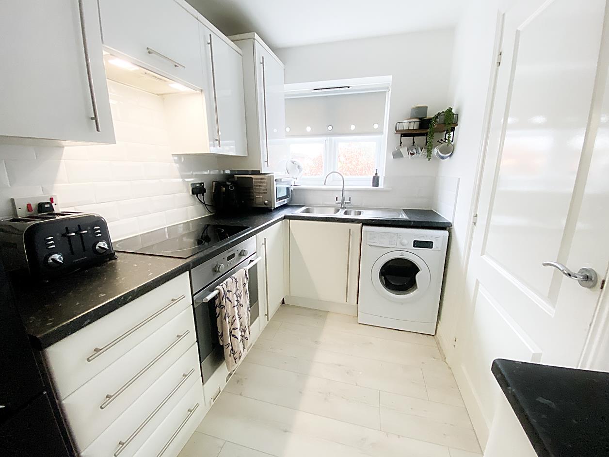 Kitchen - 10'2 x 6'0 - Double glazed window to the front elevation, fitted with a range of wall and base units with work surfaces over and sink unit, integrated oven and hob with extractor hood over, laminate flooring.