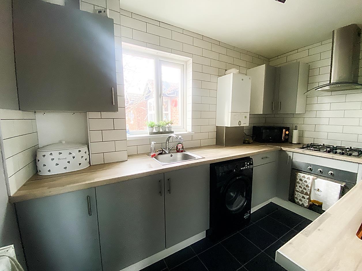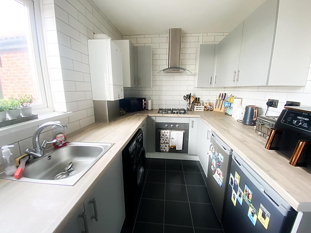Kitchen - 3.26 x 2.09 (10'8" x 6'10") - Fitted with a modern range of wall and base units with contrasting work surfaces over and sink unit, integrated oven and hob with extractor hood over, part tiled walls, double glazed window, radiator.