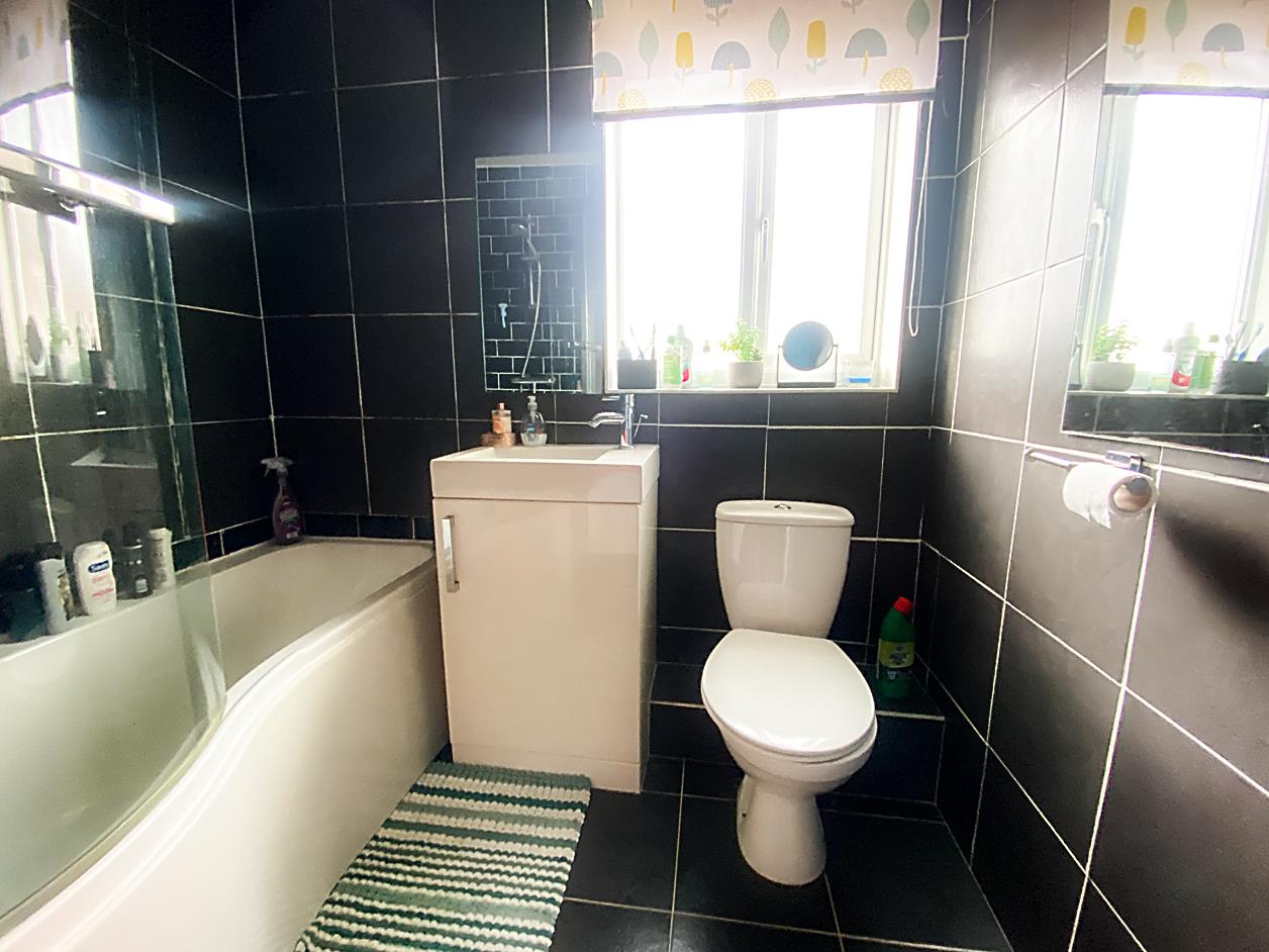 Bathroom - 2.10 x 1.65 min (6'10" x 5'4" min) - Bath with shower over, WC and wash hand basin with built-under storage, tiling to walls and floor, double glazed window, radiator.