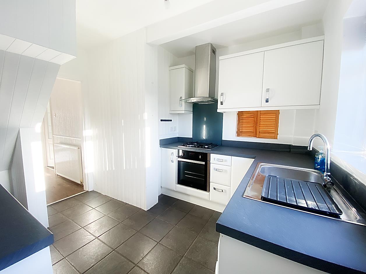 Kitchen - 3.06 x 3.35 max x 2.13 min (10'0" x 10'11" max x 6 - Fitted with a range of wall and base units with work surfaces over, integrated oven and hob with extractor hood over and sink unit, double glazed window, tiling to floor, double glazed door leading to the rear garden.