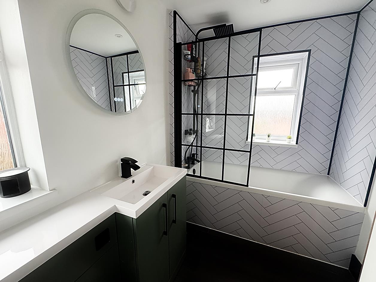 Bathroom - 1.65 c 2.59 - Two UPVc double glazed windows, vertical radiator. Tiled walls and fitted with a white suite and a shower over the bath.