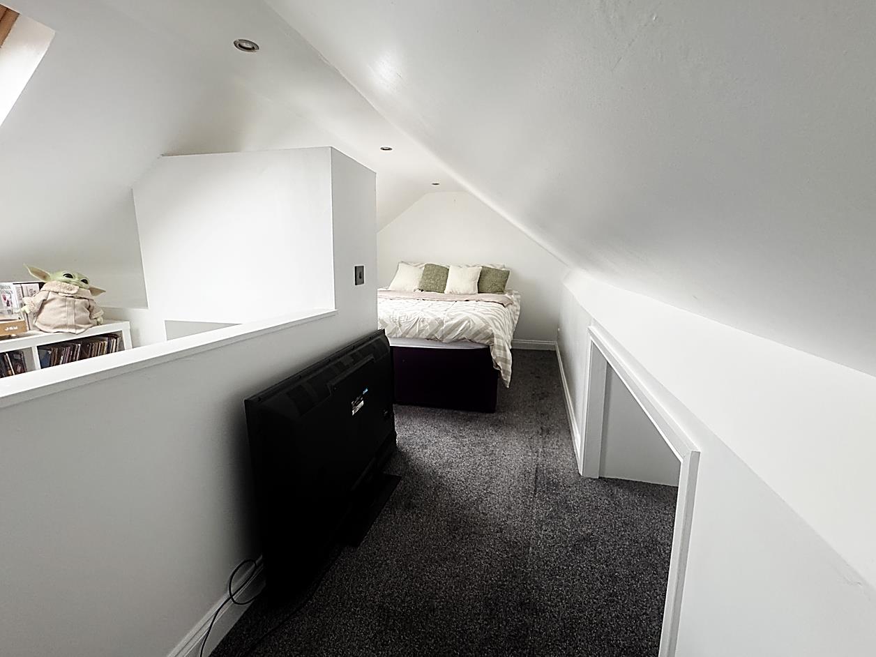 Loft Room - 2.63 x 5.94 - There is a fixed staircase to a loft room, with some restricted head room. There are skylight windows and eve storage. This is a great storage area and although has been used as a bedroom in the past, please note that there is no planning permission or building regulations for the conversion.