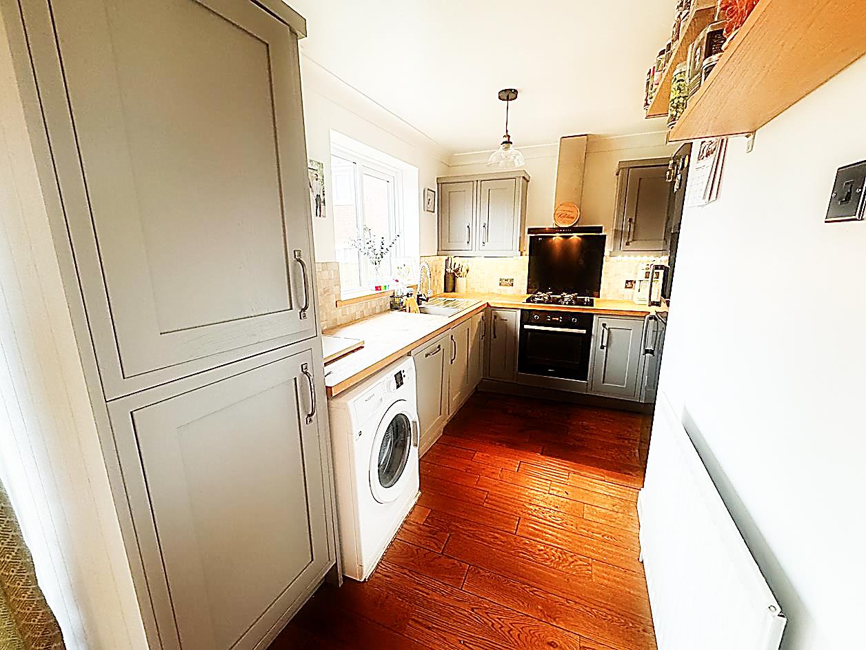Kitchen - 1.84 x 3.18 - UPVc double glazed window, and radiator. Part tiled walls and wooden style flooring. Fitted with a range of floor and wall units, counters and sink, built in gas hob with extractor hood, electric oven.