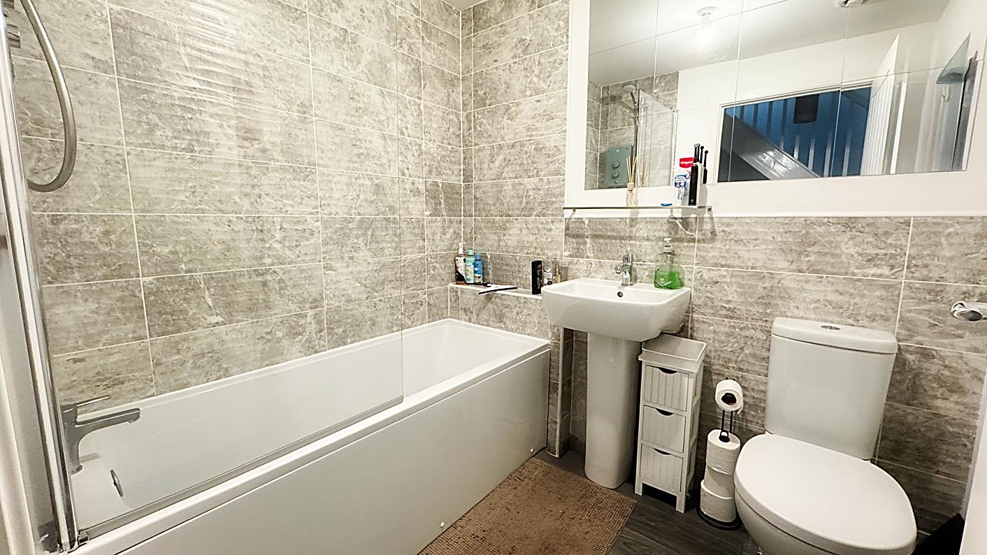 Bathroom - 2.09 x 1.80 (6'10" x 5'10") - Bath with shower over, WC and wash hand basin, part tiled walls, laminate flooring, ladder style radiator.