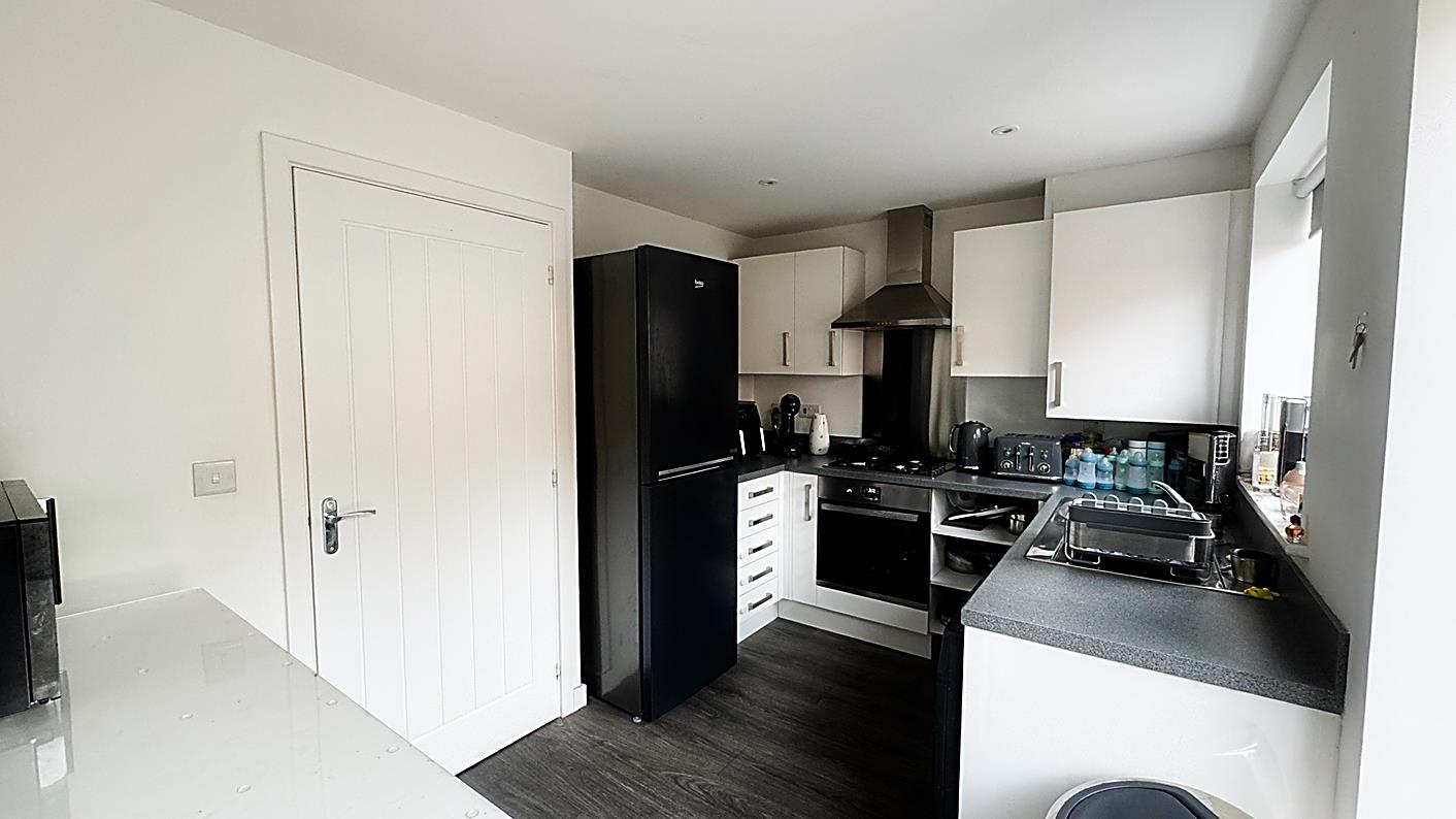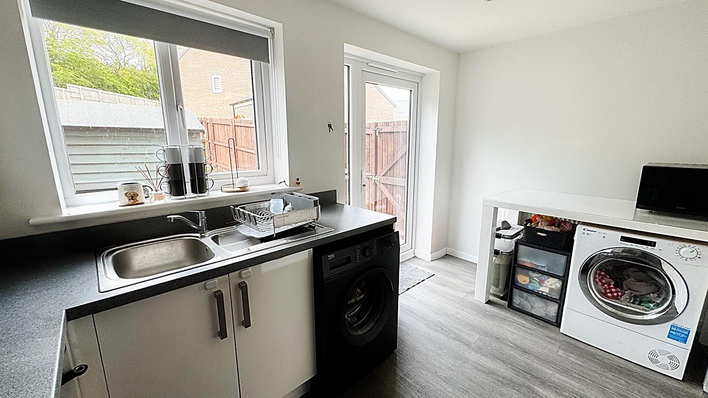 Kitchen/Diner - 3.82 x 2.51 (12'6" x 8'2") - Fitted with a modern range of wall and base units with contrasting work surfaces over, integrated oven and hob with extractor hood over, sink unit. Double glazed window, laminate flooring, and double glazed door leading out to the rear garden.