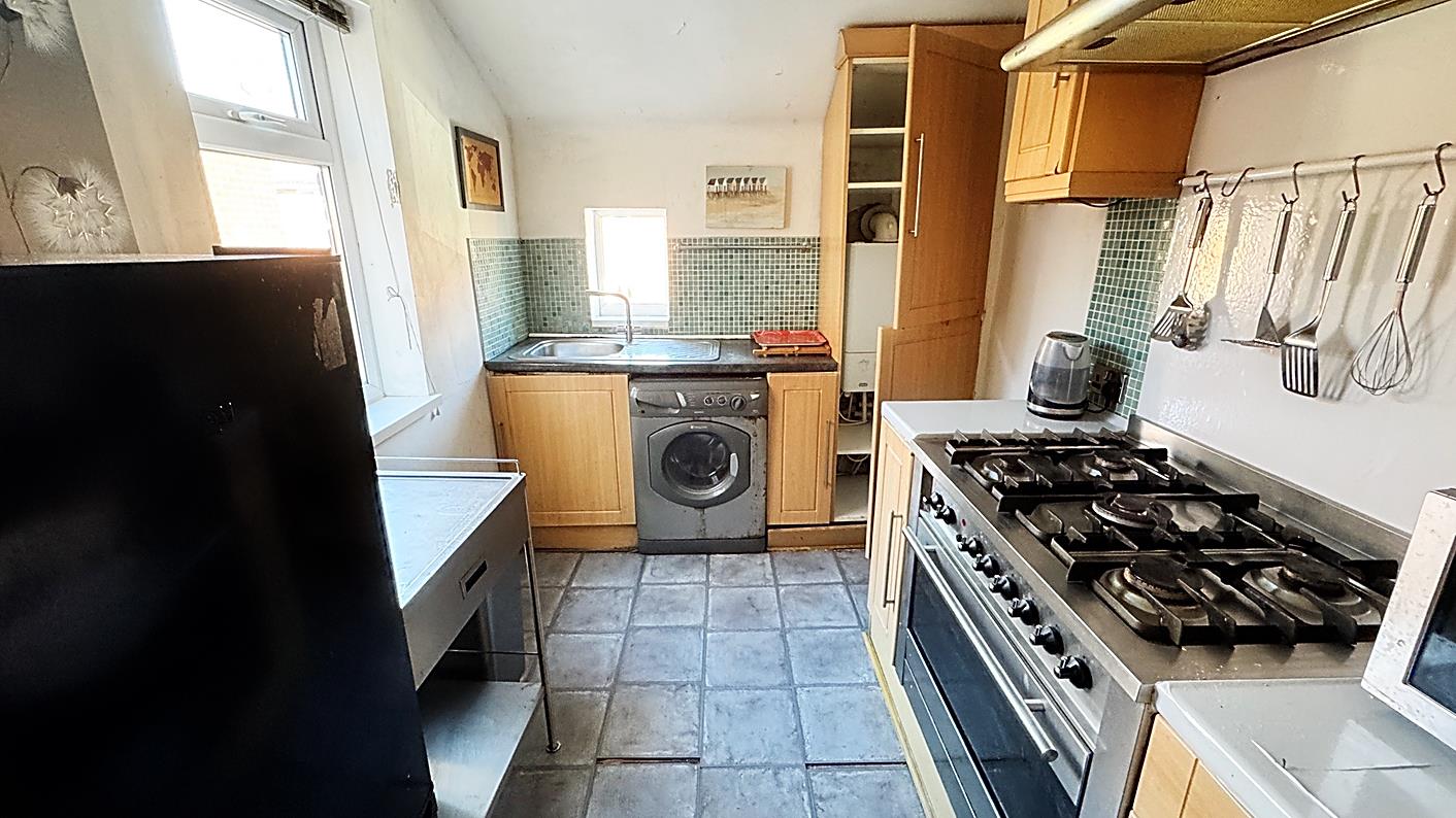 Kitchen - 2.99 x 2.15 (9'9" x 7'0") - Fitted with range of wall and floor units, tile effect laminate flooring, five ring gas hob with overhead extractor fan , built in oven, plumbed for washing machine and space for fridge freezer. Appliances there can be included but we cannot confirm in working order.