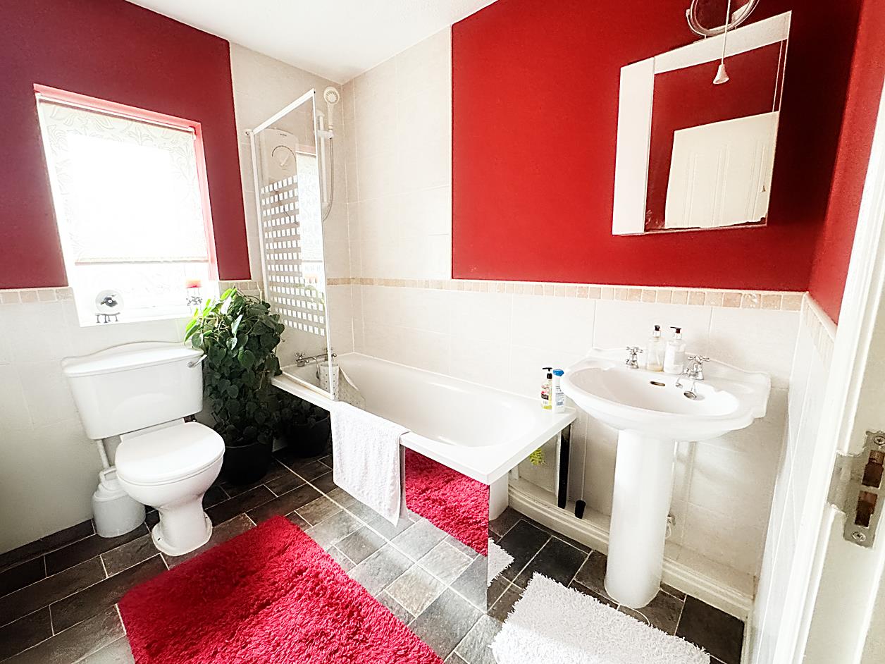 Bathroom - 6'0 X 7'9 - A white suite comprising; bath with overhead shower, WC, wash hand basin, tiling to the walls, radiator and double glazed window.
