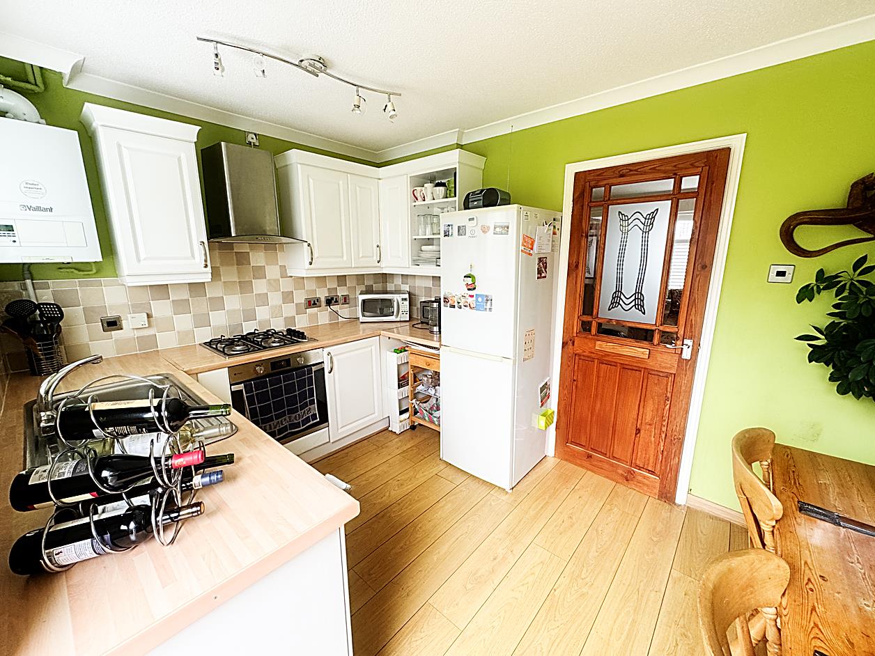Kitchen/Diner - 9'0 x 12'10 - Fitted with a range of wall and base units, work surfaces, tiling to walls, sink, built in gas hob, oven and extractor hood, double glazed window with plantation shutters, French doors into rear garden, radiator.