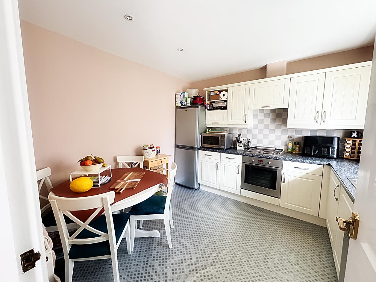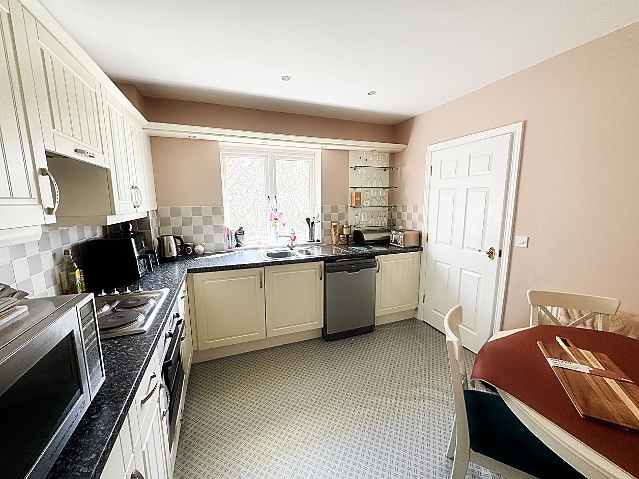 Kitchen - 3.28m x 3.10m - Fitted with a range of wall and base units. One and a half bowl sink unit with built in electric oven and hob with overhead extractor hood, plumbed for washing machine and space for a fridge freezer and dishwasher. Double glazed window and radiator.