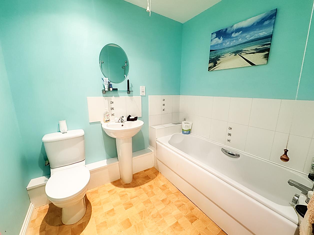 Bathroom - Comprising: WC, was hand basin, bat with overhead shower and part tiled walls. Radiator and extractor fan.