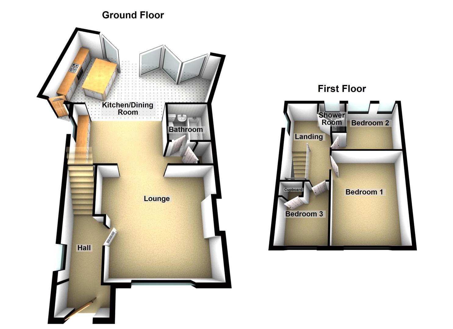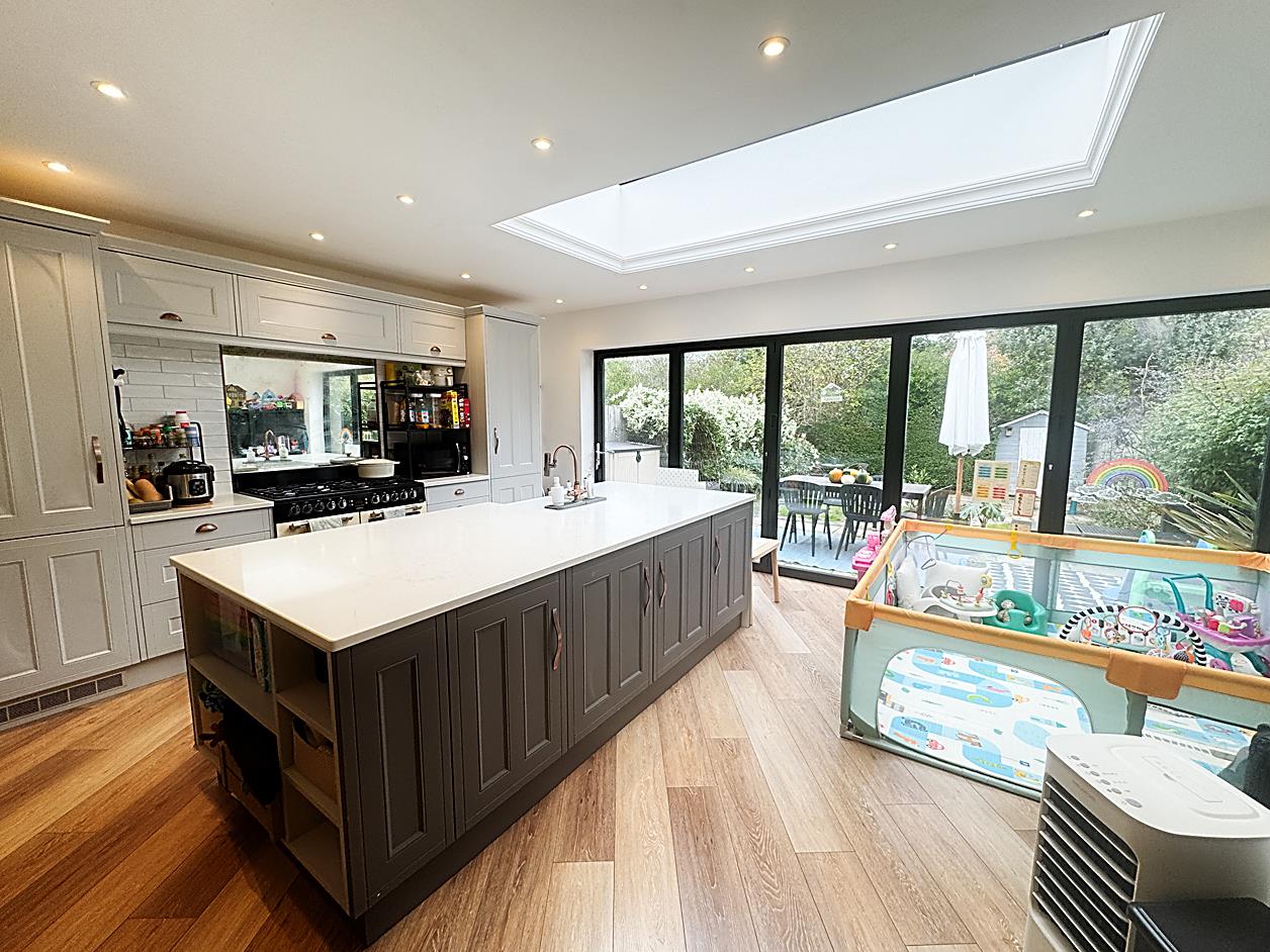 Kitchen/Diner - kitchen 3.81 x 2.97 max (kitchen 12'5" x 9'8" ma - Dining Area 6.11 x 5.17 - kitchen has been extended to give a lovely open plan kitchen/diner with extensive range of wall and base units with complementary worktops, sink set in island, integrated under counter fridge and freezer, dishwasher and range style oven, plumbed for washing machine, composite door giving access driveway and bifold doors giving access to rear garden. Radiator and laminate flooring.