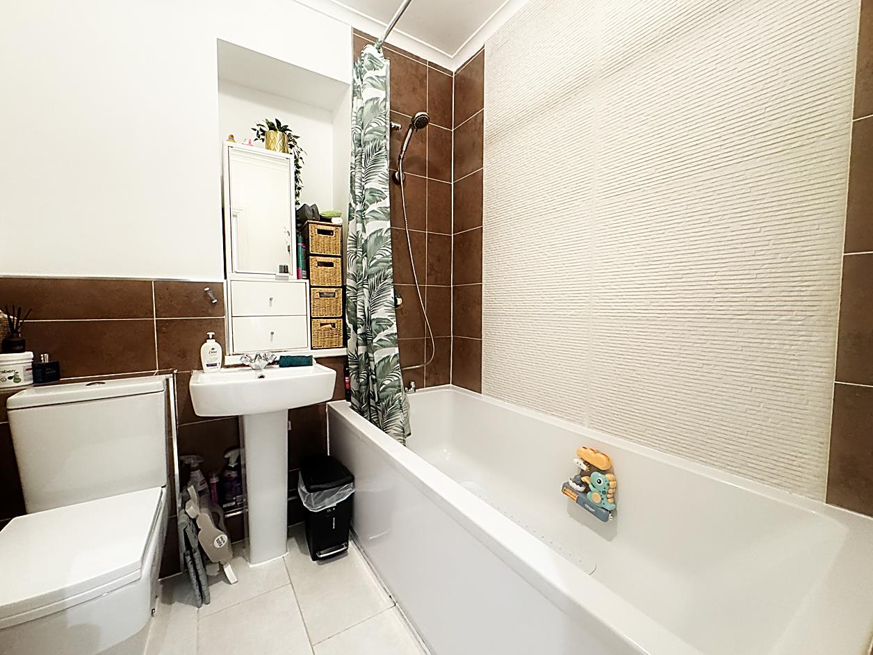 Bathroom - 1.95 x 1.94 (6'4" x 6'4" ) - Comprising; WC, hand wash basin, bath with overhead shower, radiator, part tiled walls and floor.