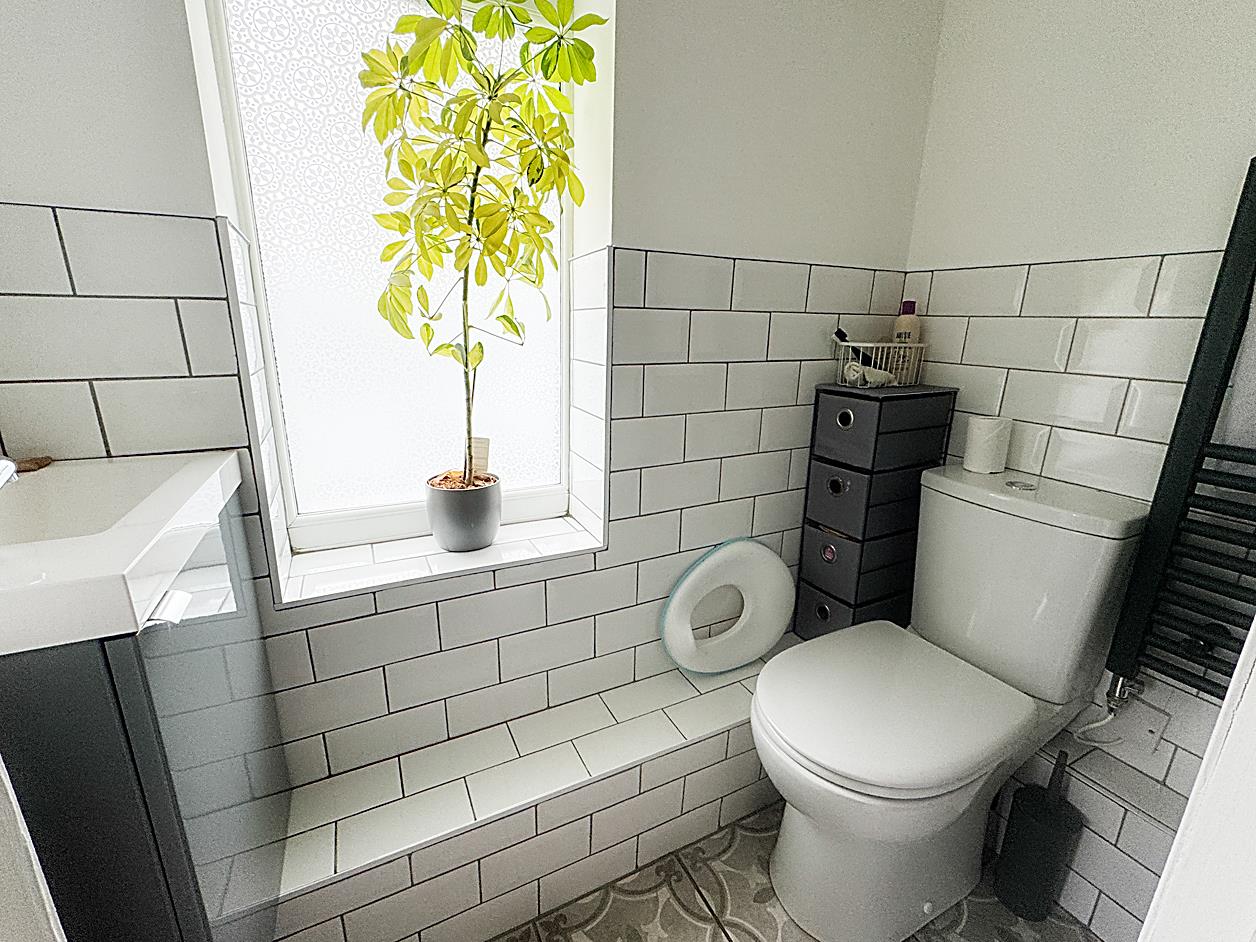 Shower Room - Comprising; WC, hand wash basin set in vanity unit and separate shower cubicle. Part tiled walls, ladder style radiator, laminate flooring and double glazed window.