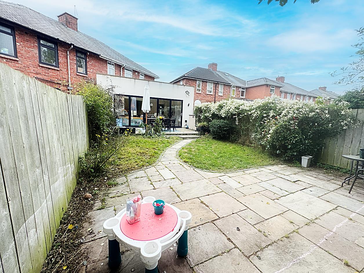 External - Private rear garden with patio area and to the front there is a stone driveway for multiple cars.