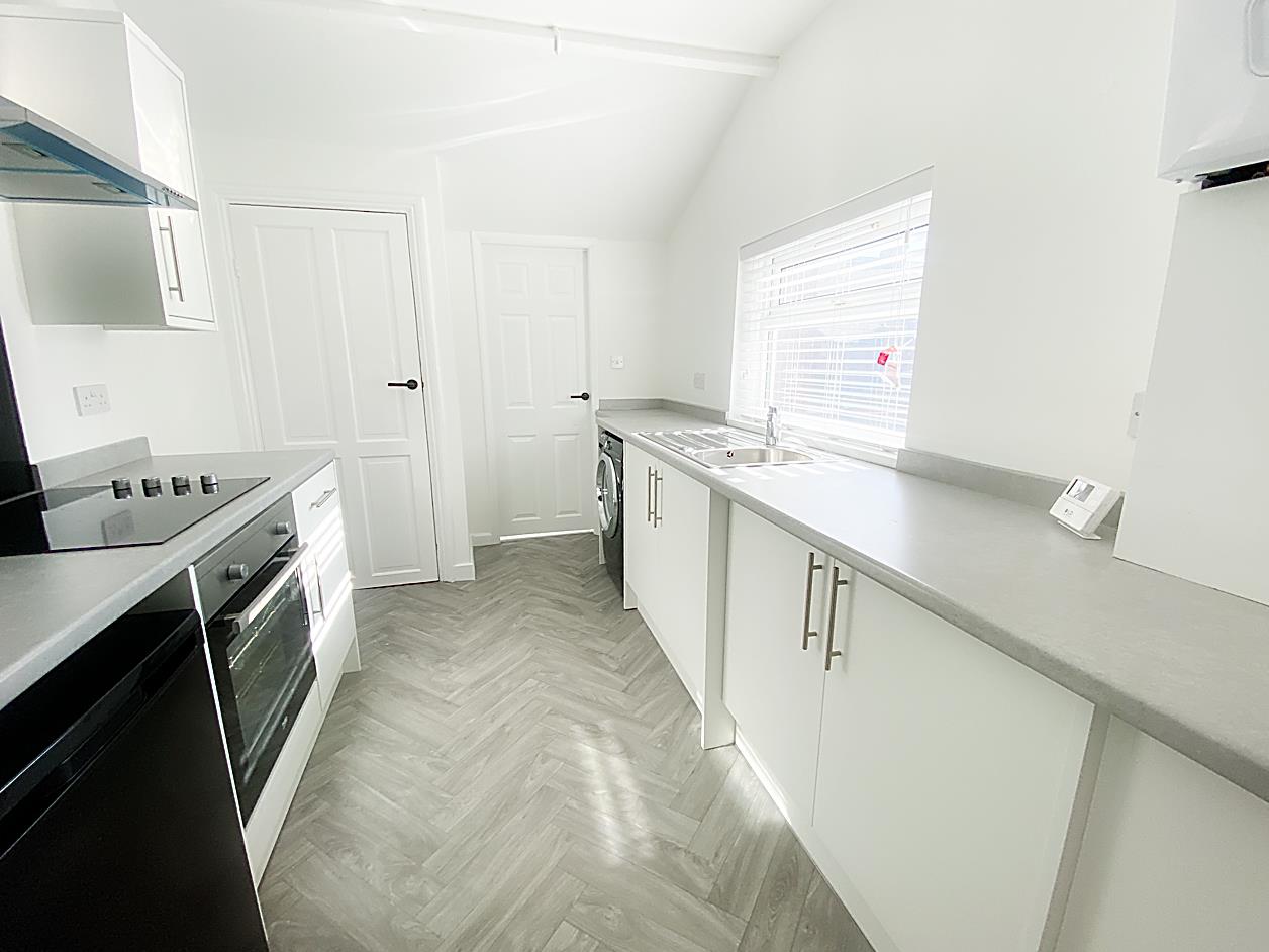 Kitchen - 3.49 x 2.39 (11'5" x 7'10") - Fitted with a range of wall and base units with contrasting work surfaces over and sink unit, integrated oven and hob with extractor hood over, double glazed window, radiator and door to rear stairs.