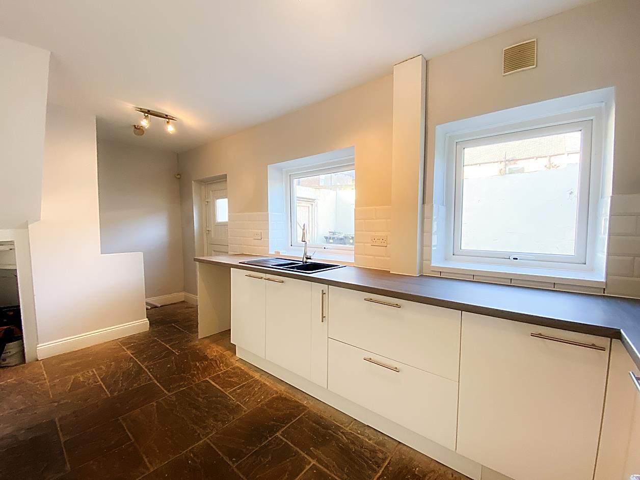 Kitchen - 5.48 x 2.73 (17'11" x 8'11") - Fitted with wall and base units with works surfaces over, integrated oven and hob with extractor hood over and sink unit, double glazed window, tiled flooring, radiator and external door to the rear yard.