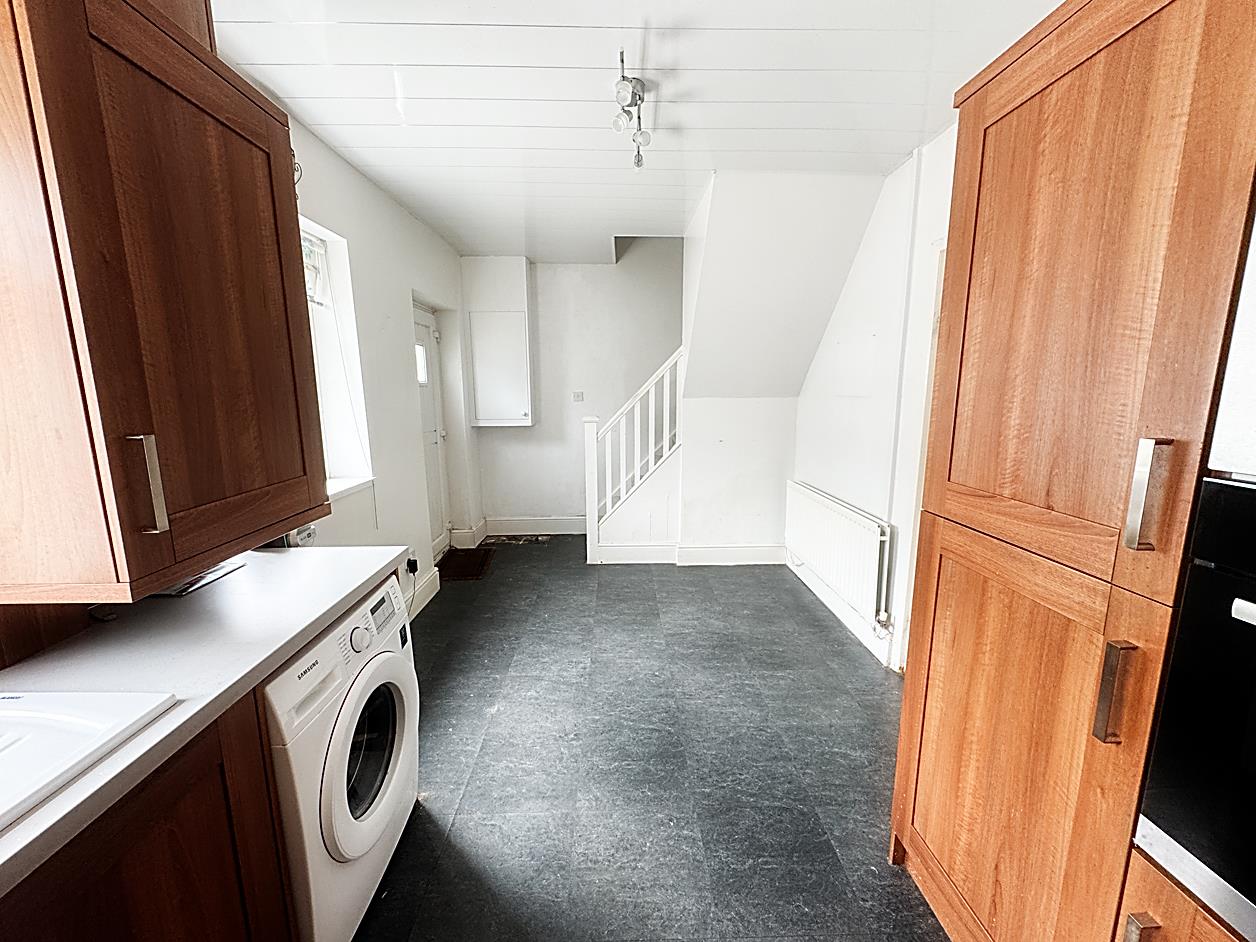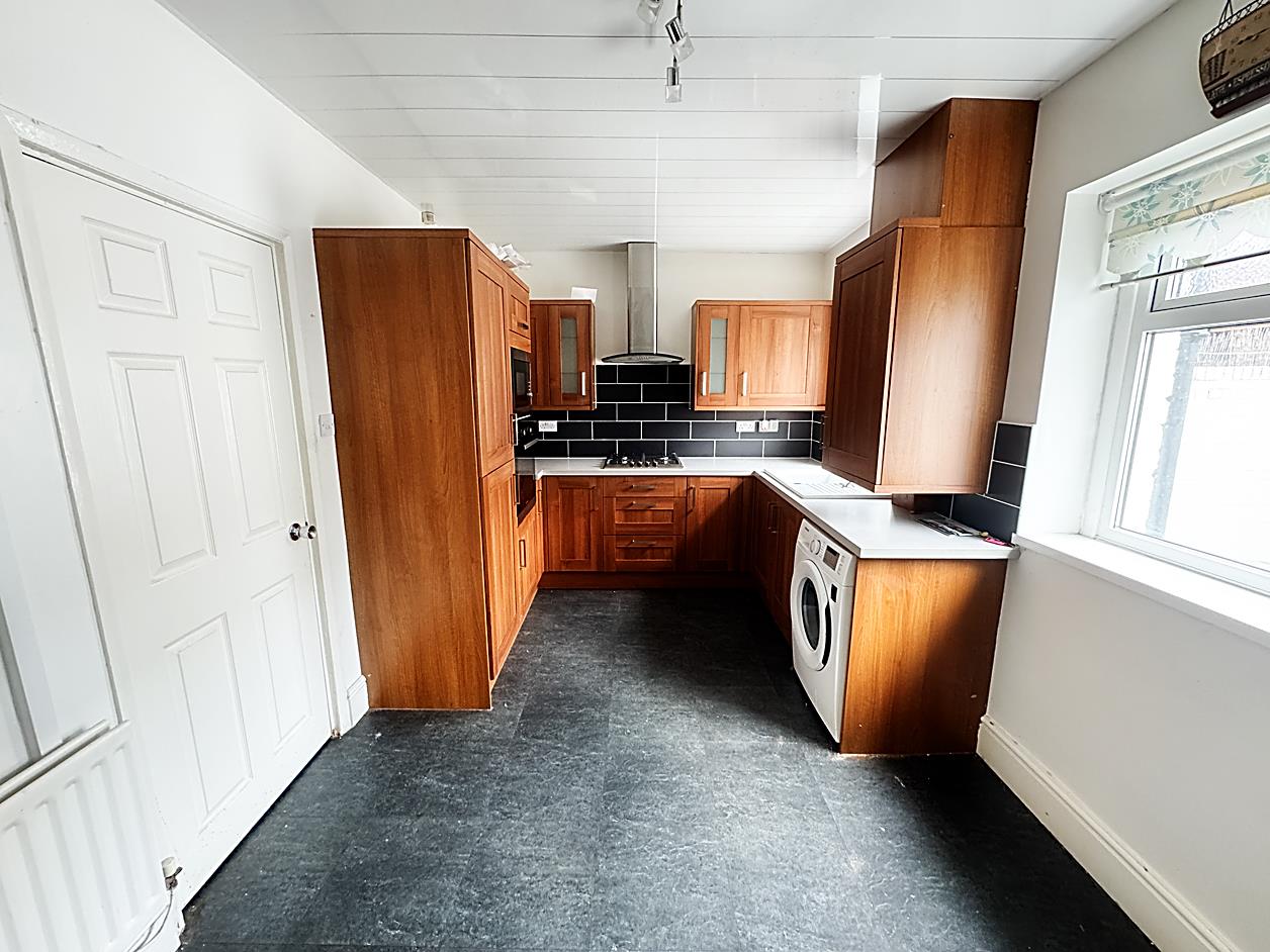 Kitchen - 5.45 x 2.68 (17'10" x 8'9" ) - Double glazed window and door giving access to private rear yard. Fitted with range of floor and wall units with complimentary worktops, integrated, fridge freezer, built in oven and microwave, hob with overhead extractor hood, sink. Plumbed for washing machine, radiator and part tiled walls.