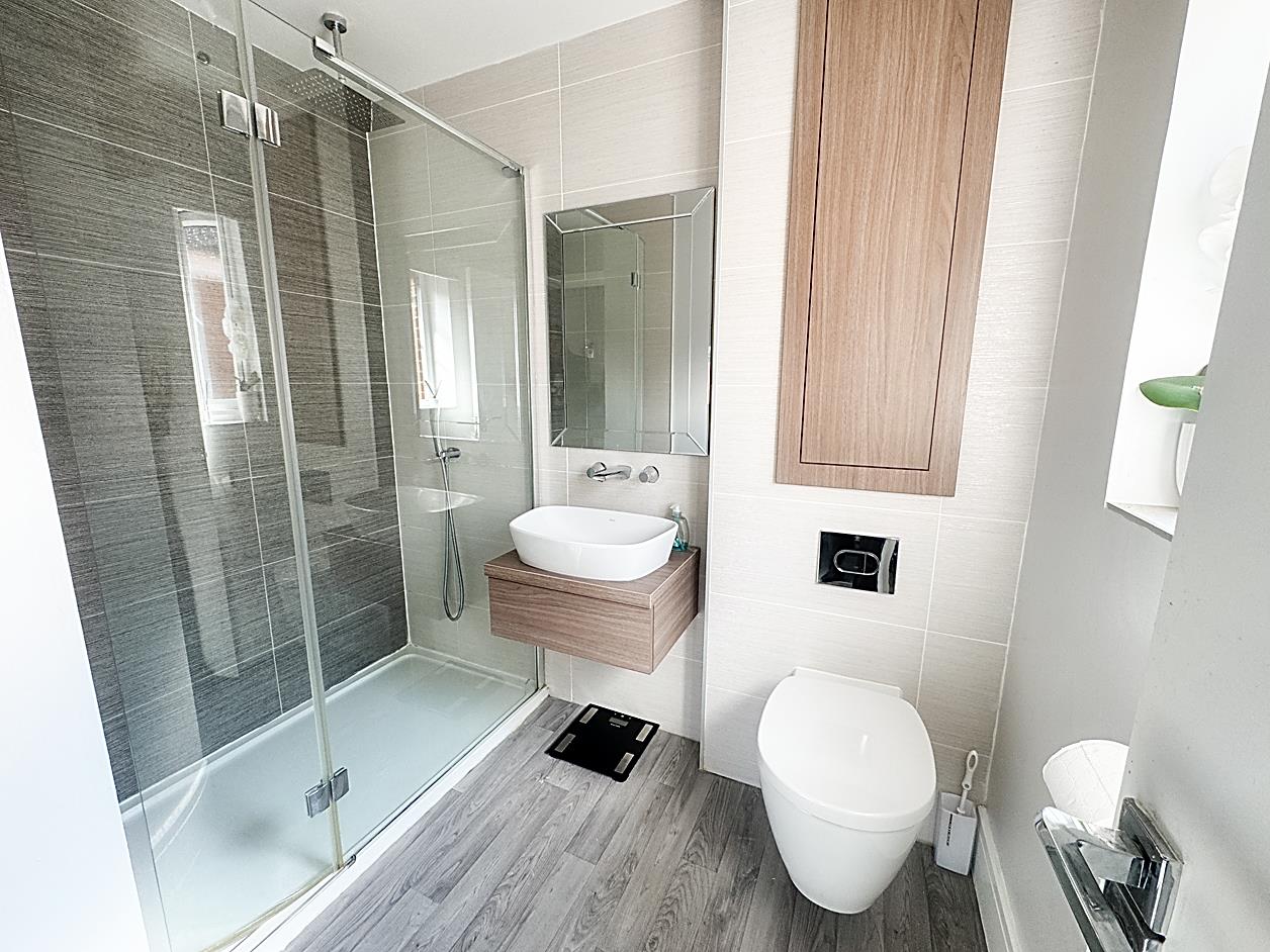 En-Suite - 2.28 x 2.00 (7'5" x 6'6") - Double glazed window, ladder style radiator, part tiled walls, WC, walk in shower, wash hand basin.