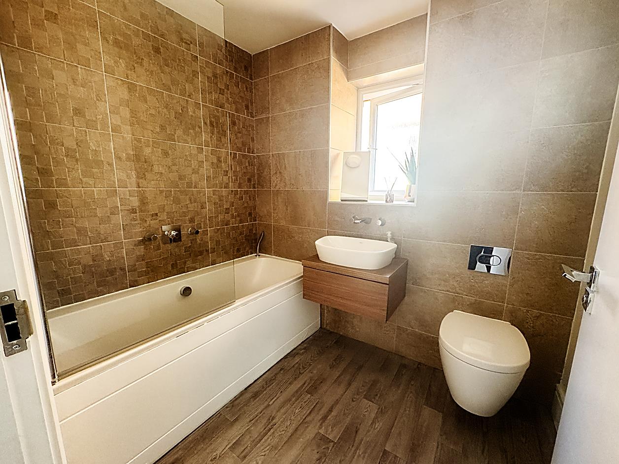 Family Bathroom - 2.26 x 1.69 (7'4" x 5'6") - Double glazed window, radiator, bath with overhead shower, WC and wash hand basin. Part tiled walls.