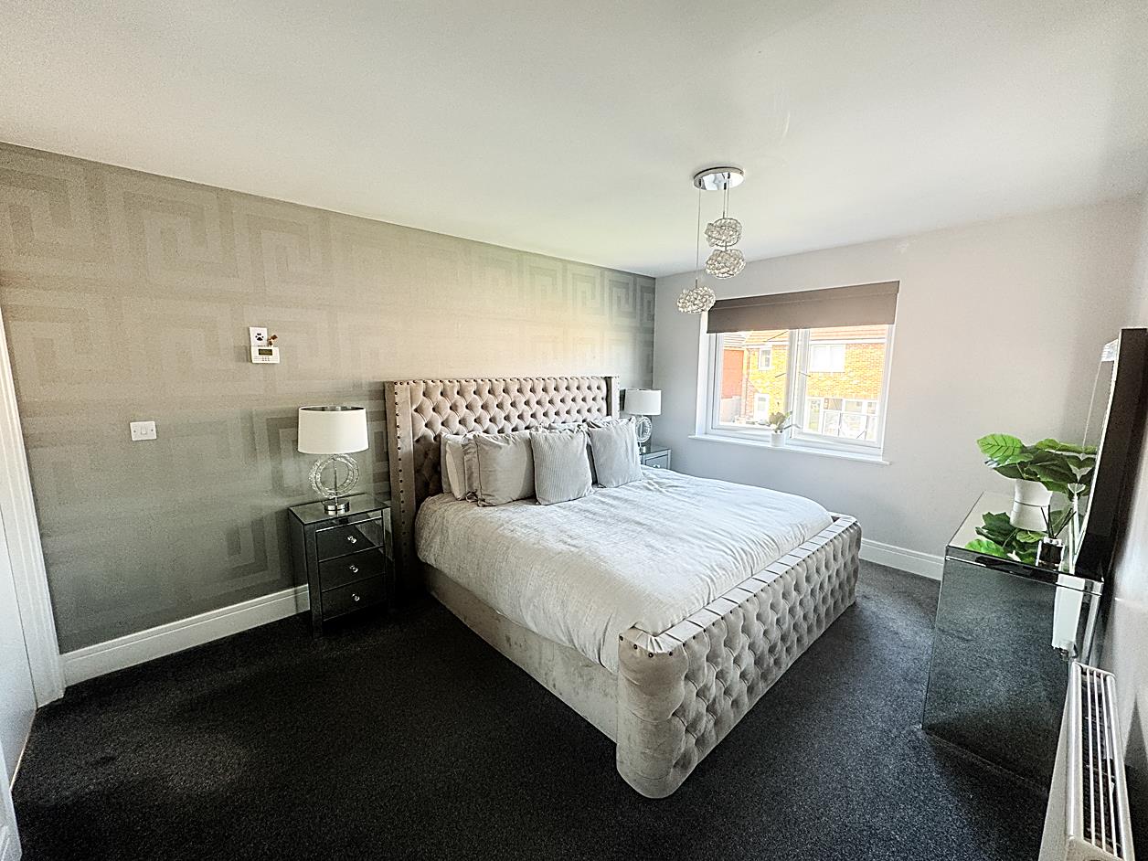 Master Bedroom - 4.32 x 3.14 (14'2" x 10'3" ) - Double glazed window, radiator, sliding door wardrobes. Rear Elevation.